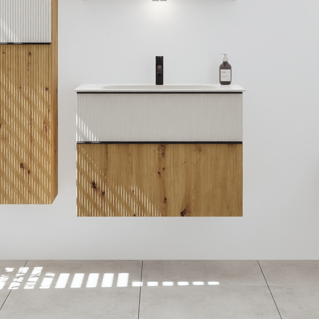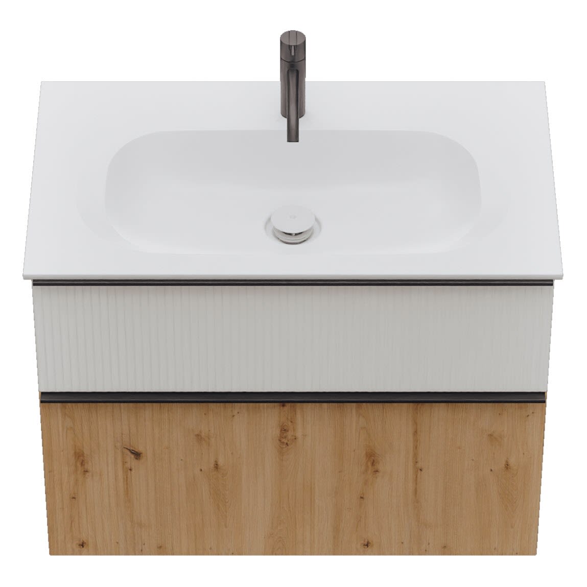 - 1 Schublade oben: 35 cm tief, mit vertikaler Struktur inkl. Siphonausschnitt und Inneneinteilung