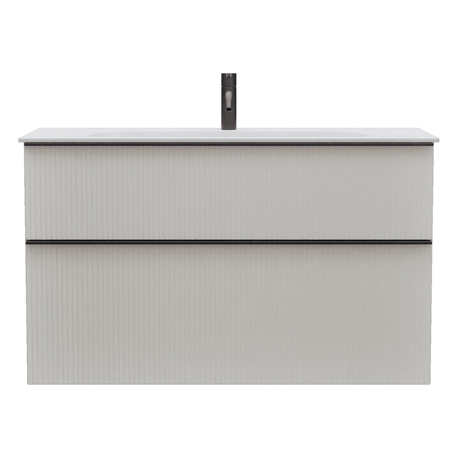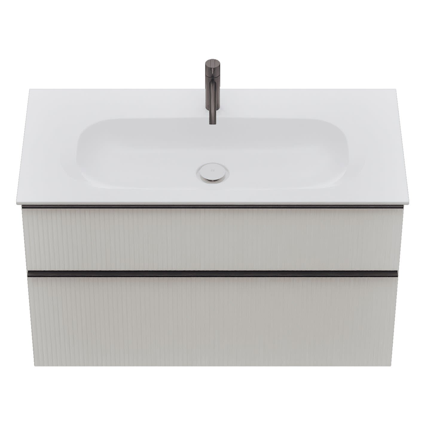 - 1 Schublade oben, 35 cm tief, mit vertikaler Struktur inkl. Siphonausschnitt und Inneneinteilung