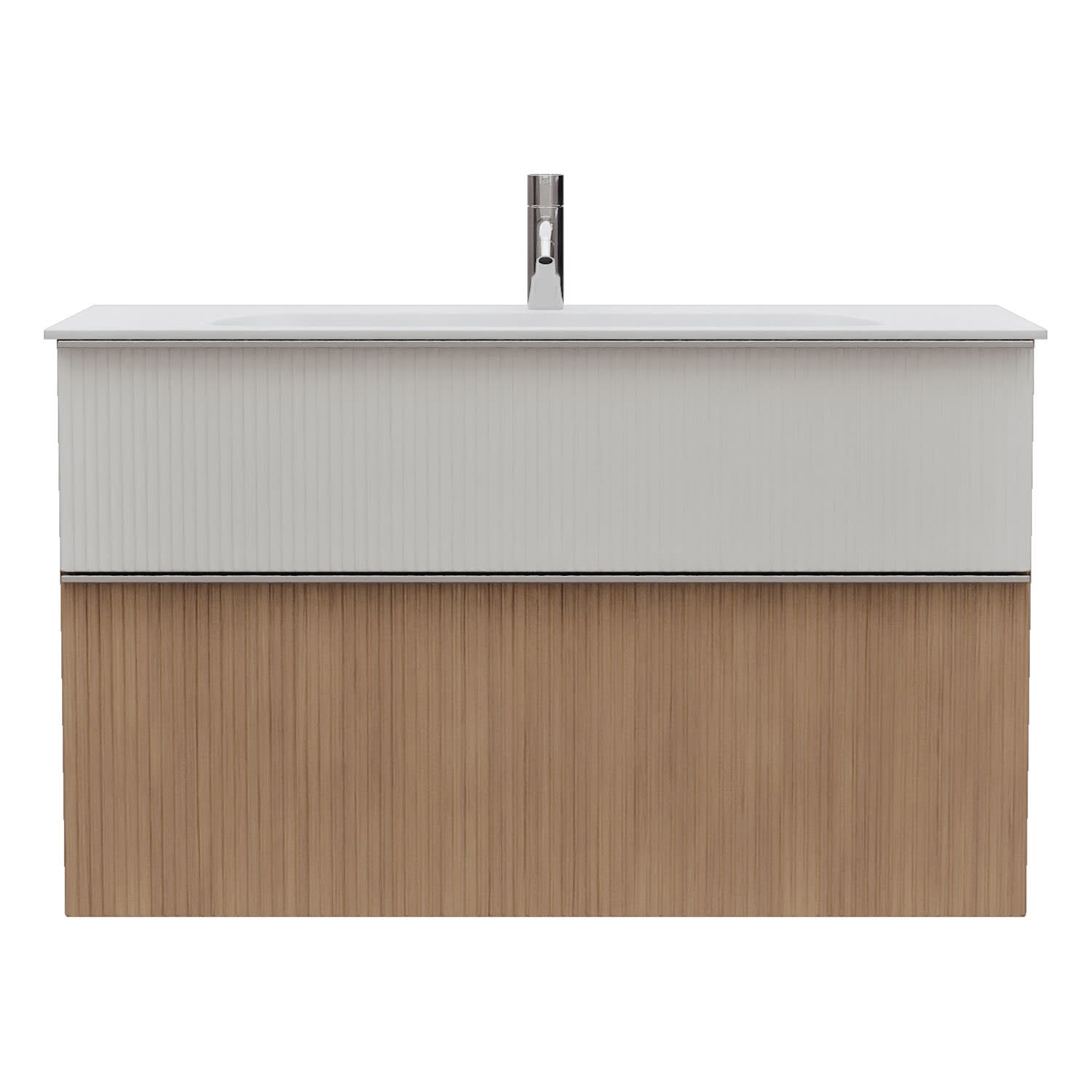 - 1 Schublade oben, 35 cm tief, mit vertikaler Struktur inkl. Siphonausschnitt und Inneneinteilung