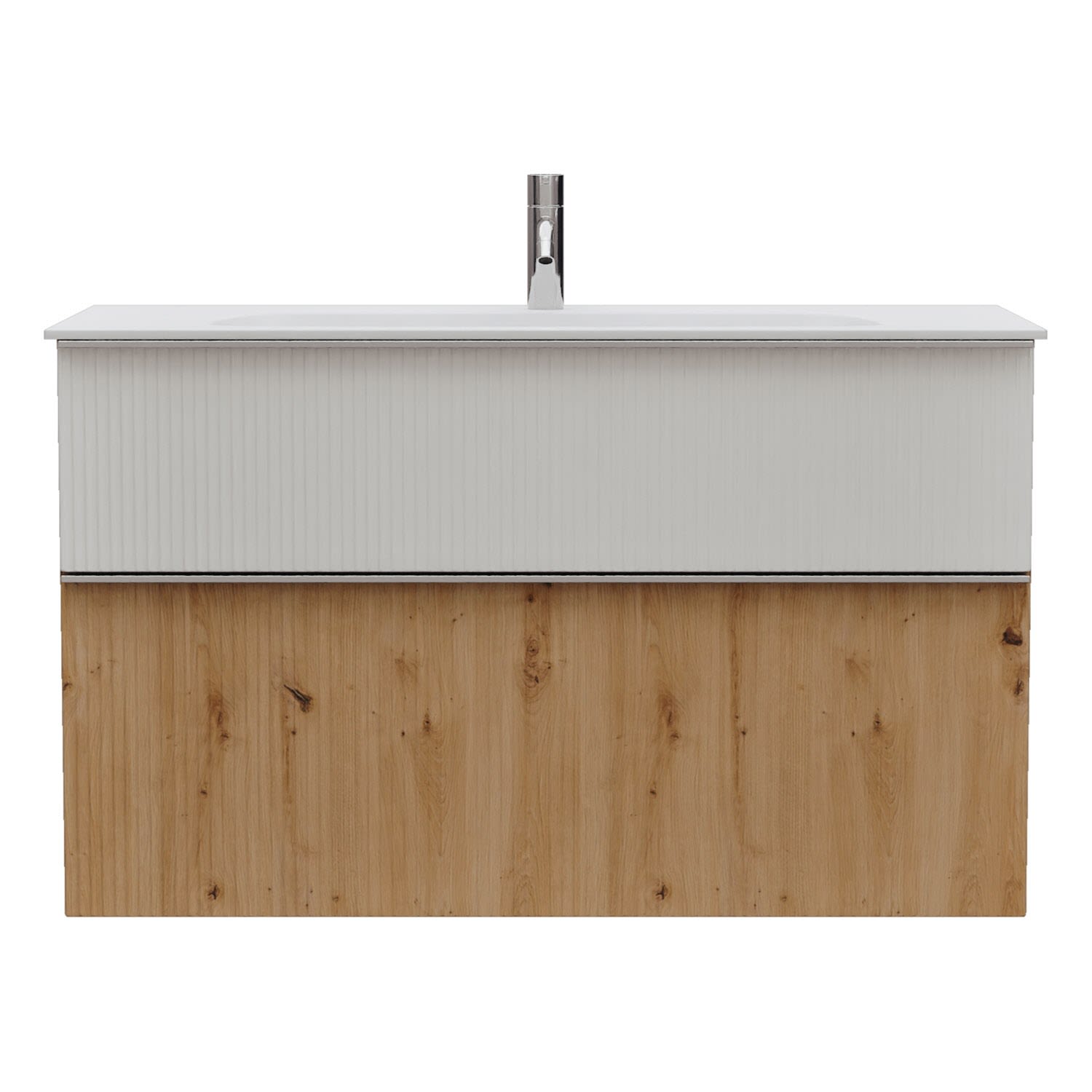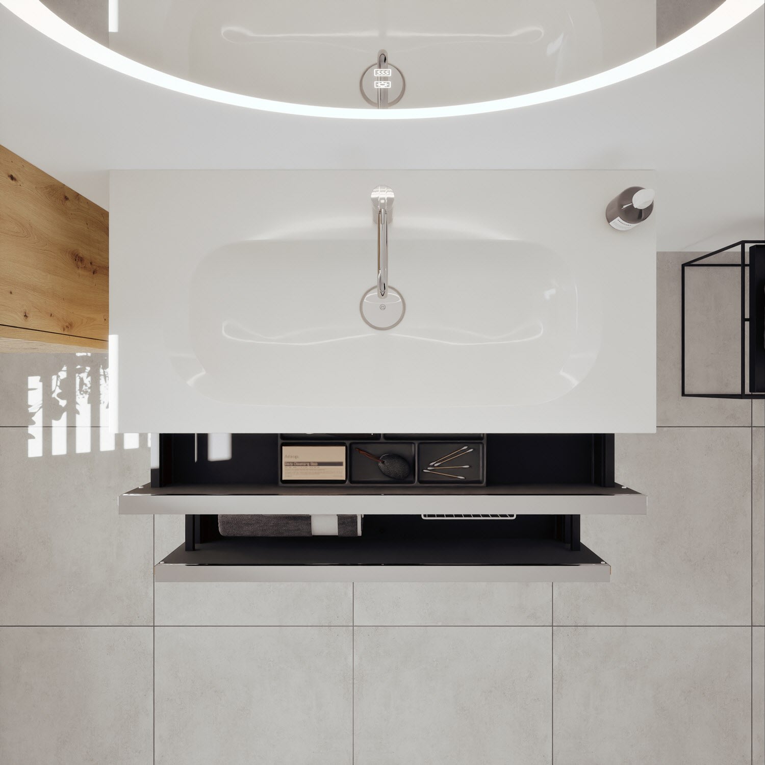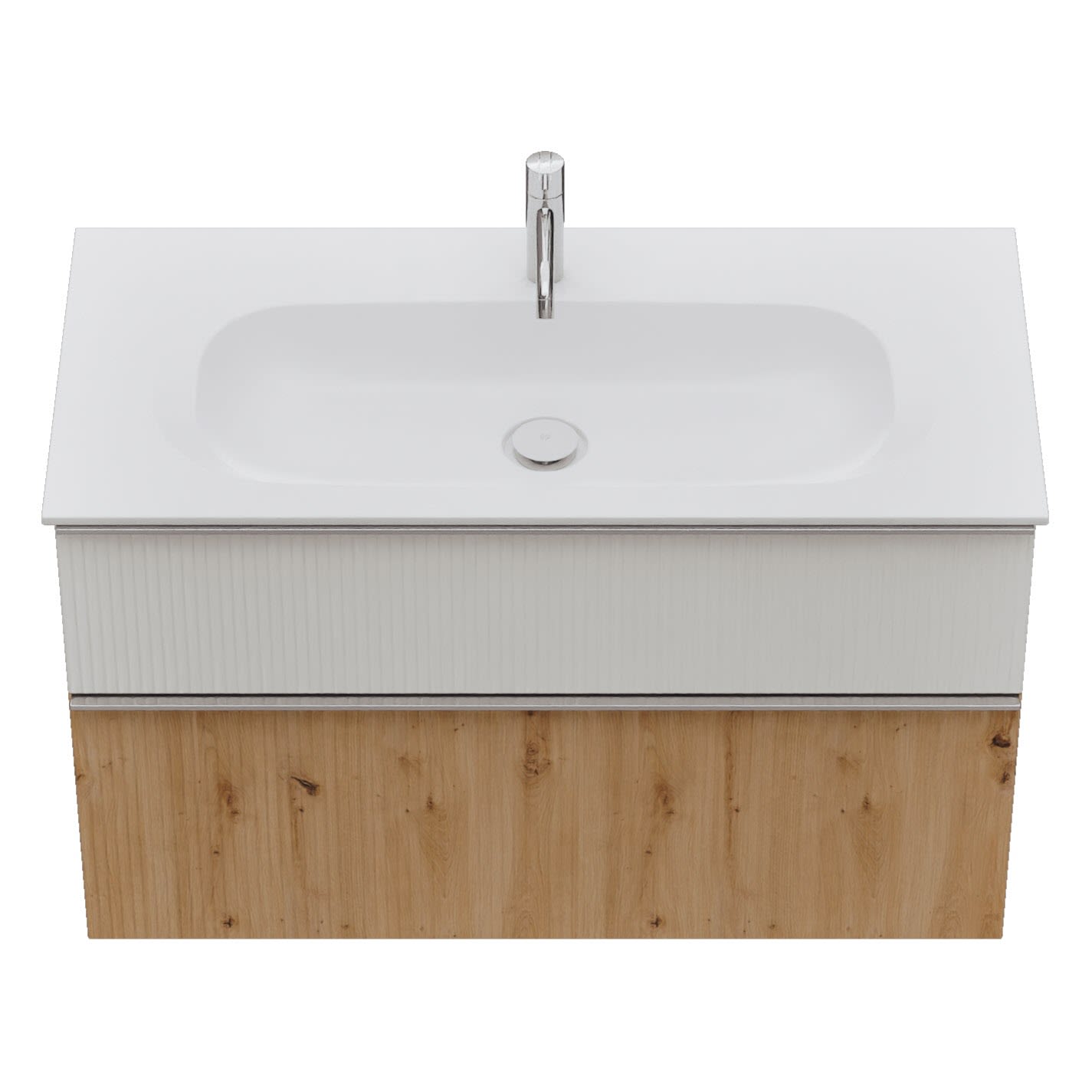 - 1 Schublade oben, 35 cm tief, mit vertikaler Struktur inkl. Siphonausschnitt und Inneneinteilung