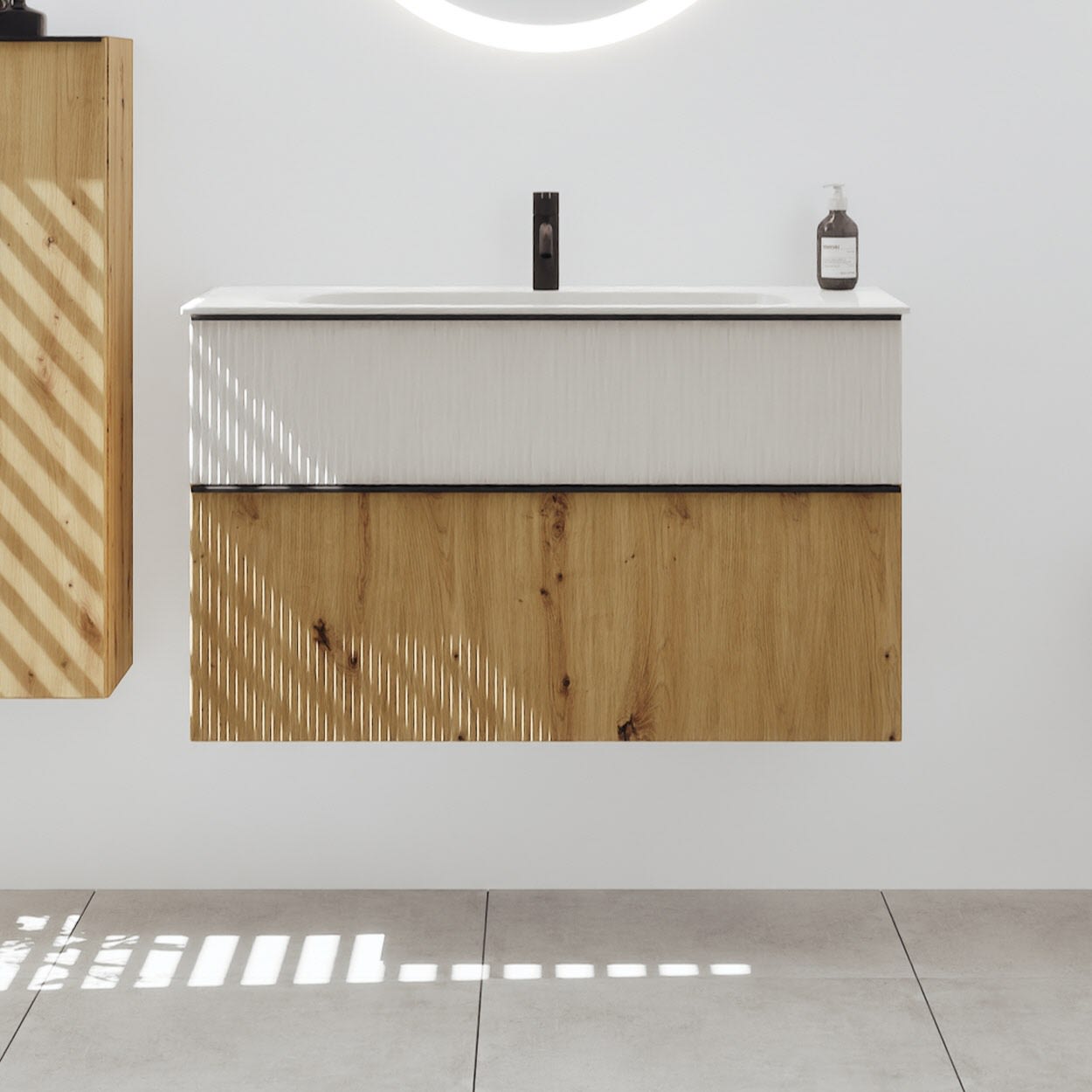 - 1 Schublade oben, 35 cm tief, mit vertikaler Struktur inkl. Siphonausschnitt und Inneneinteilung