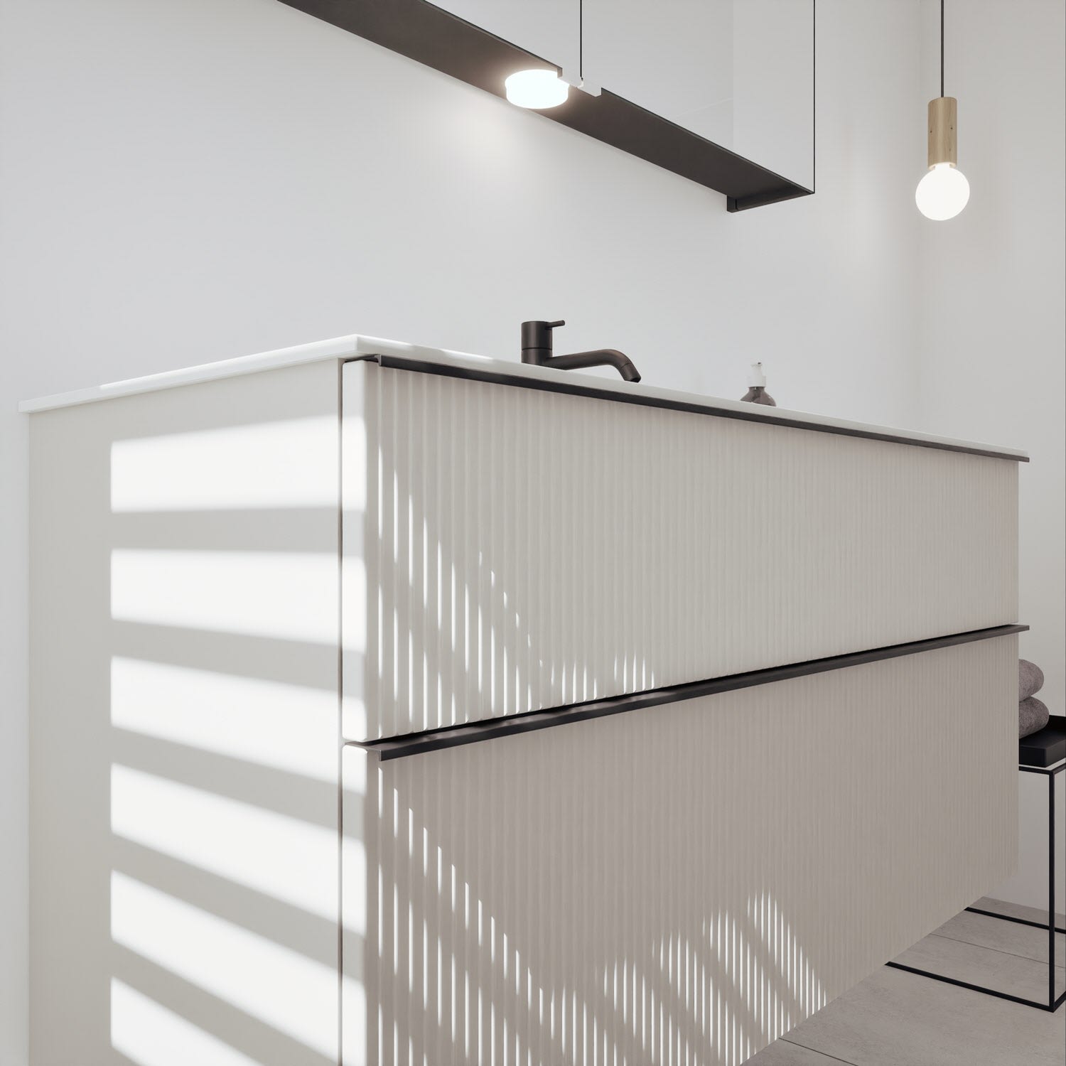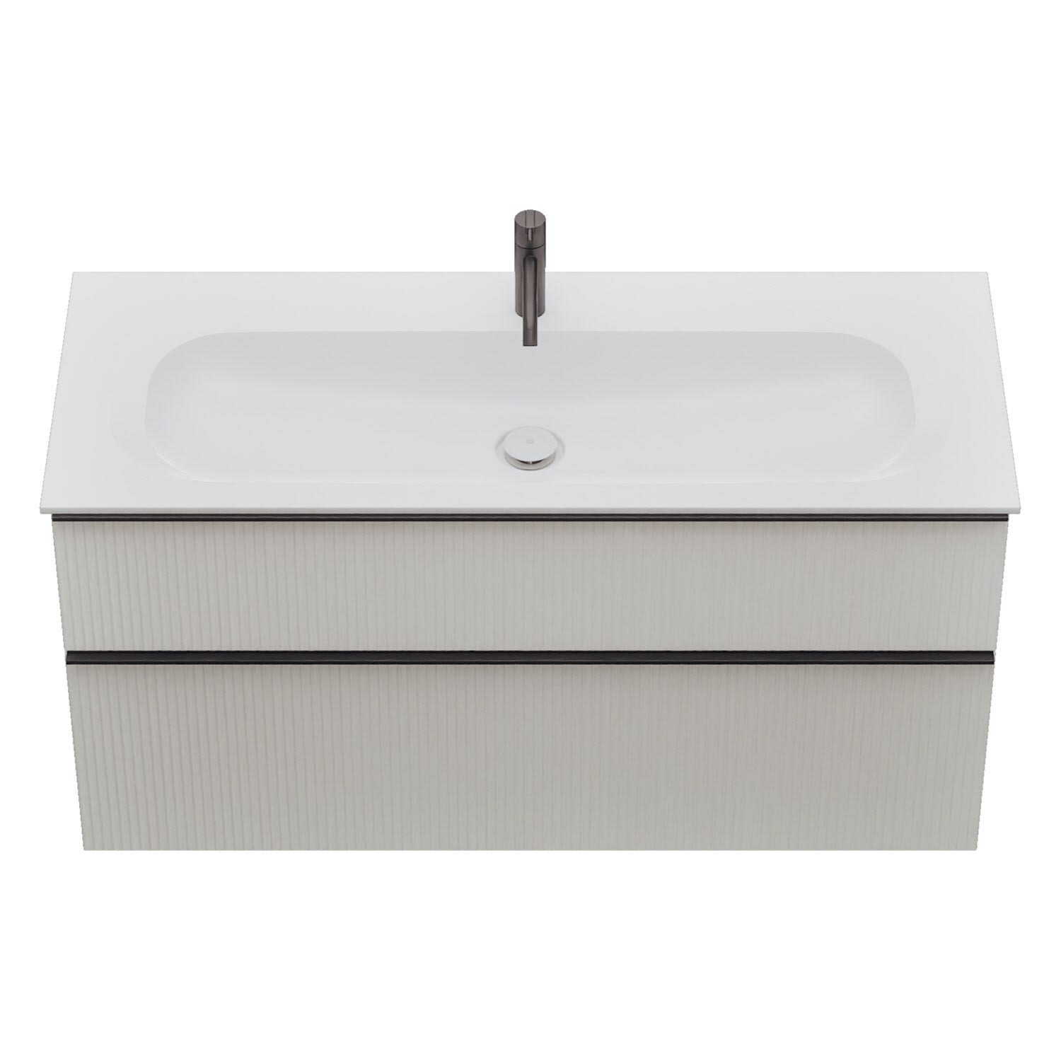 - 1 Schublade oben, 35 cm tief, mit vertikaler Struktur inkl. Siphonausschnitt und Inneneinteilung