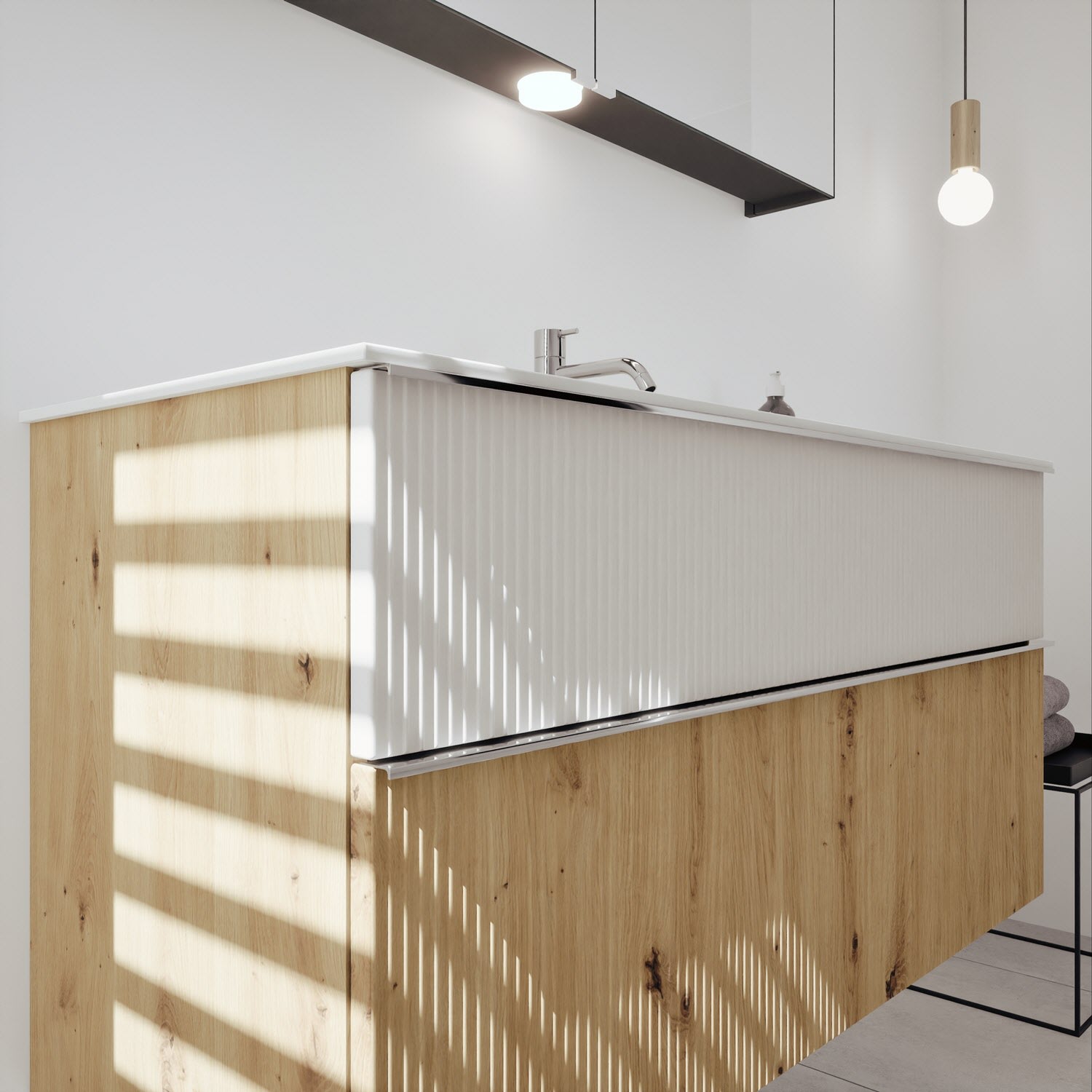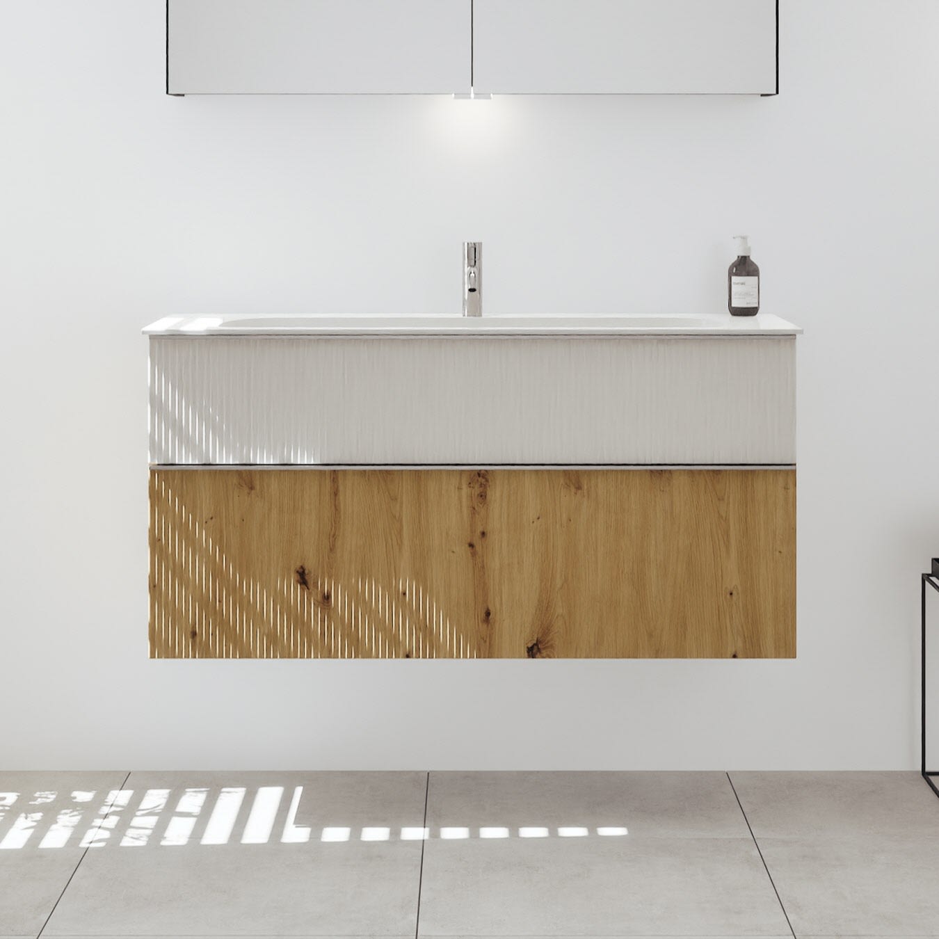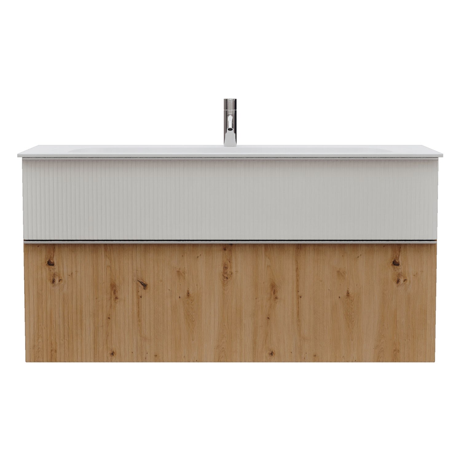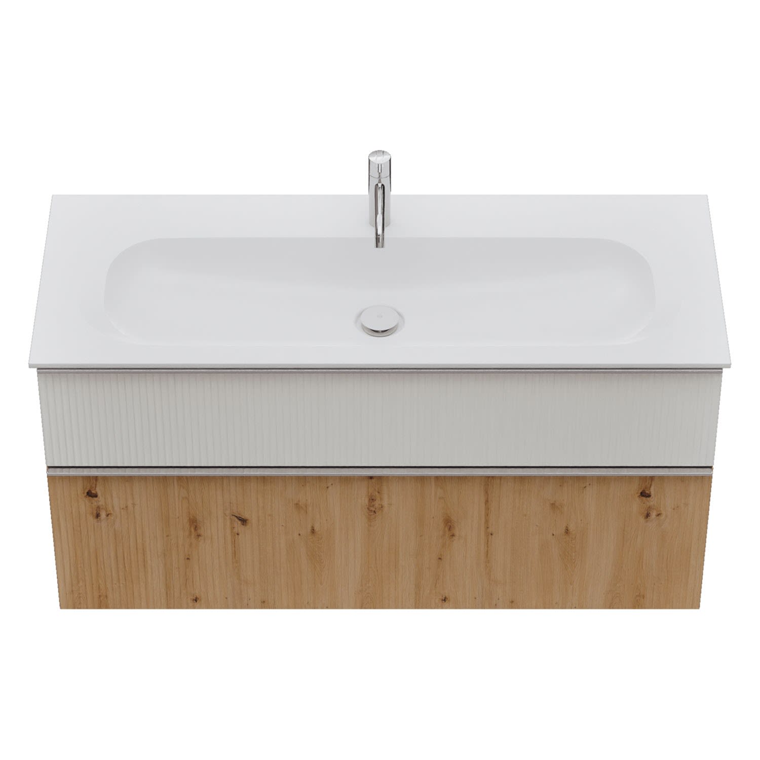 - 1 Schublade oben, 35 cm tief, mit vertikaler Struktur inkl. Siphonausschnitt und Inneneinteilung