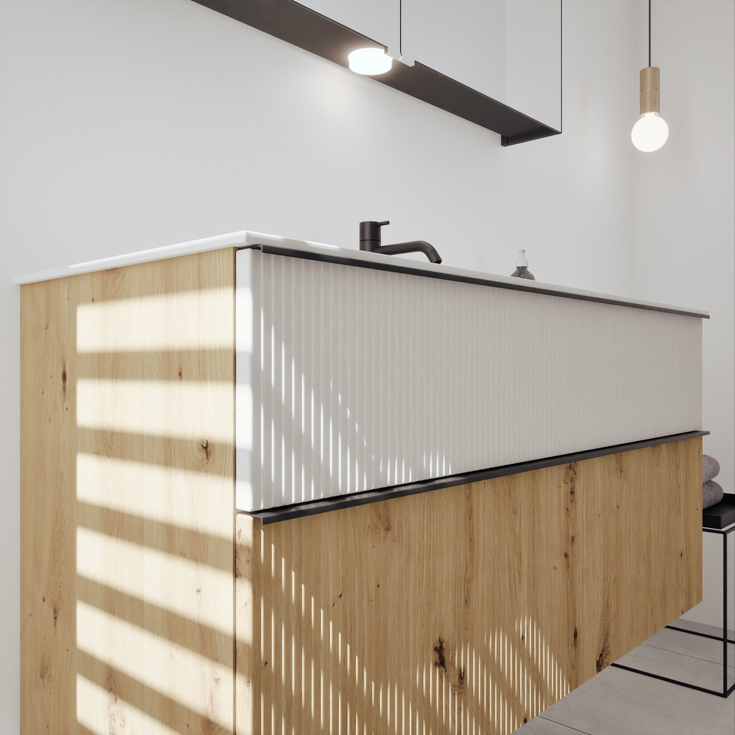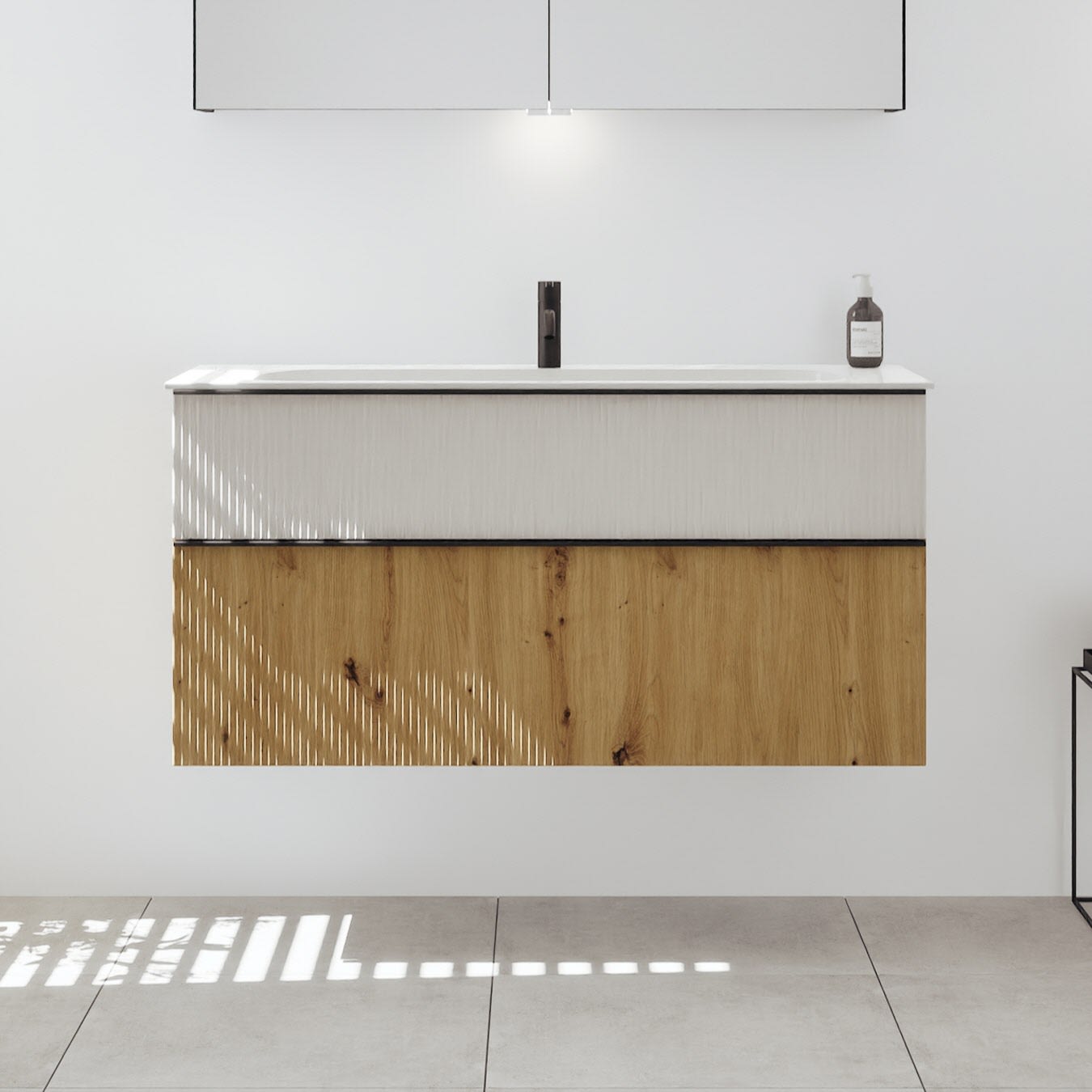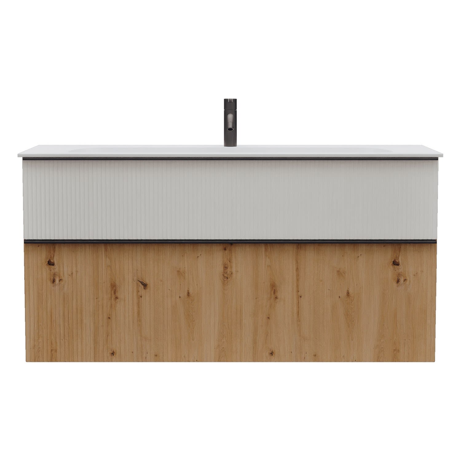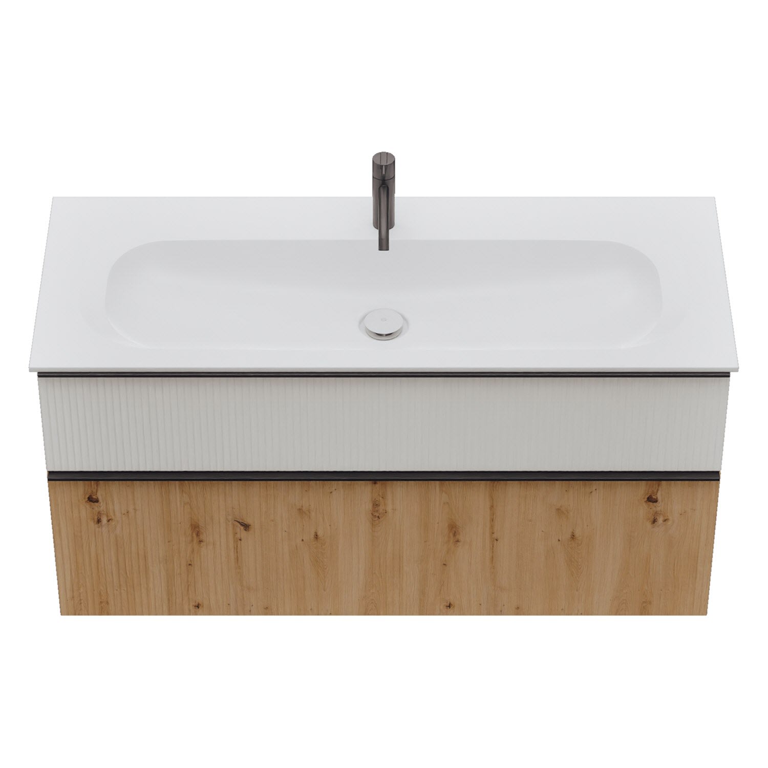 - 1 Schublade oben, 35 cm tief, mit vertikaler Struktur inkl. Siphonausschnitt und Inneneinteilung