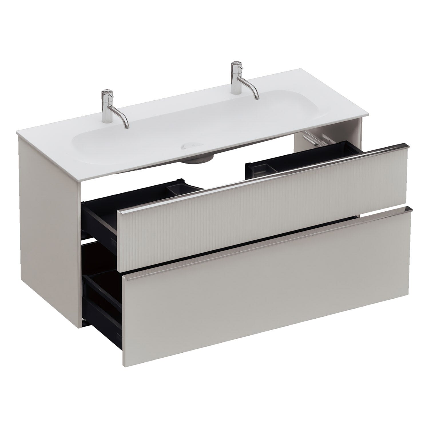 - 1 Schublade oben: 35 cm tief, mit vertikaler Struktur inkl. Siphonausschnitt und Inneneinteilung