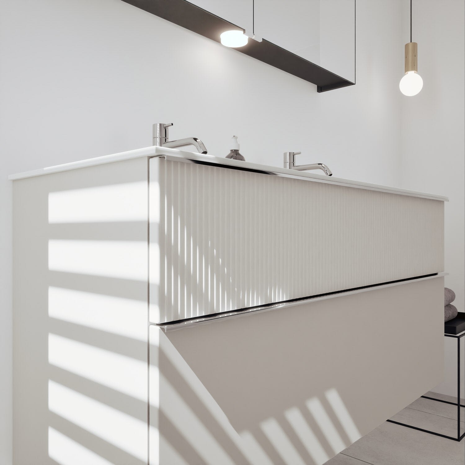 - 1 Schublade oben: 35 cm tief, mit vertikaler Struktur inkl. Siphonausschnitt und Inneneinteilung