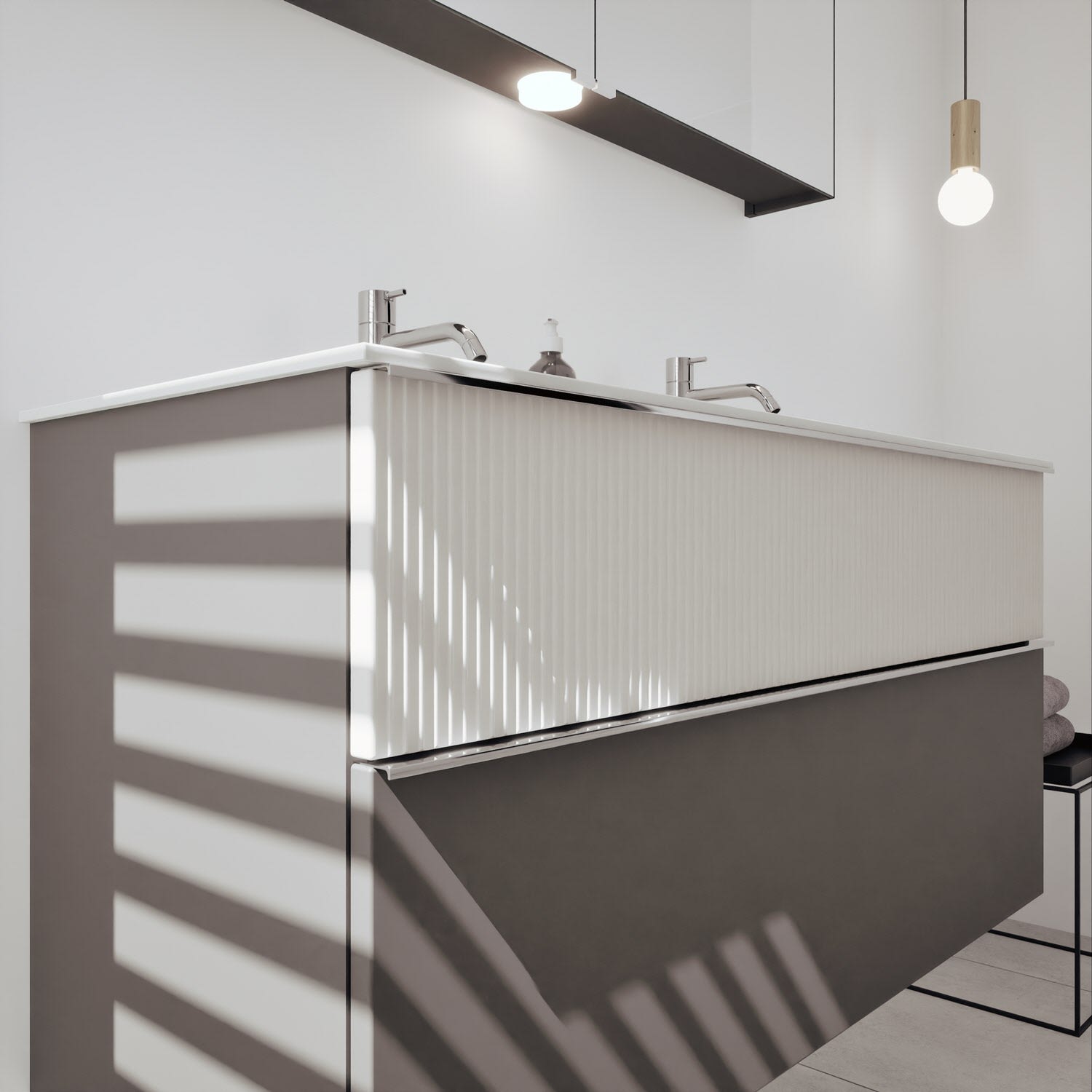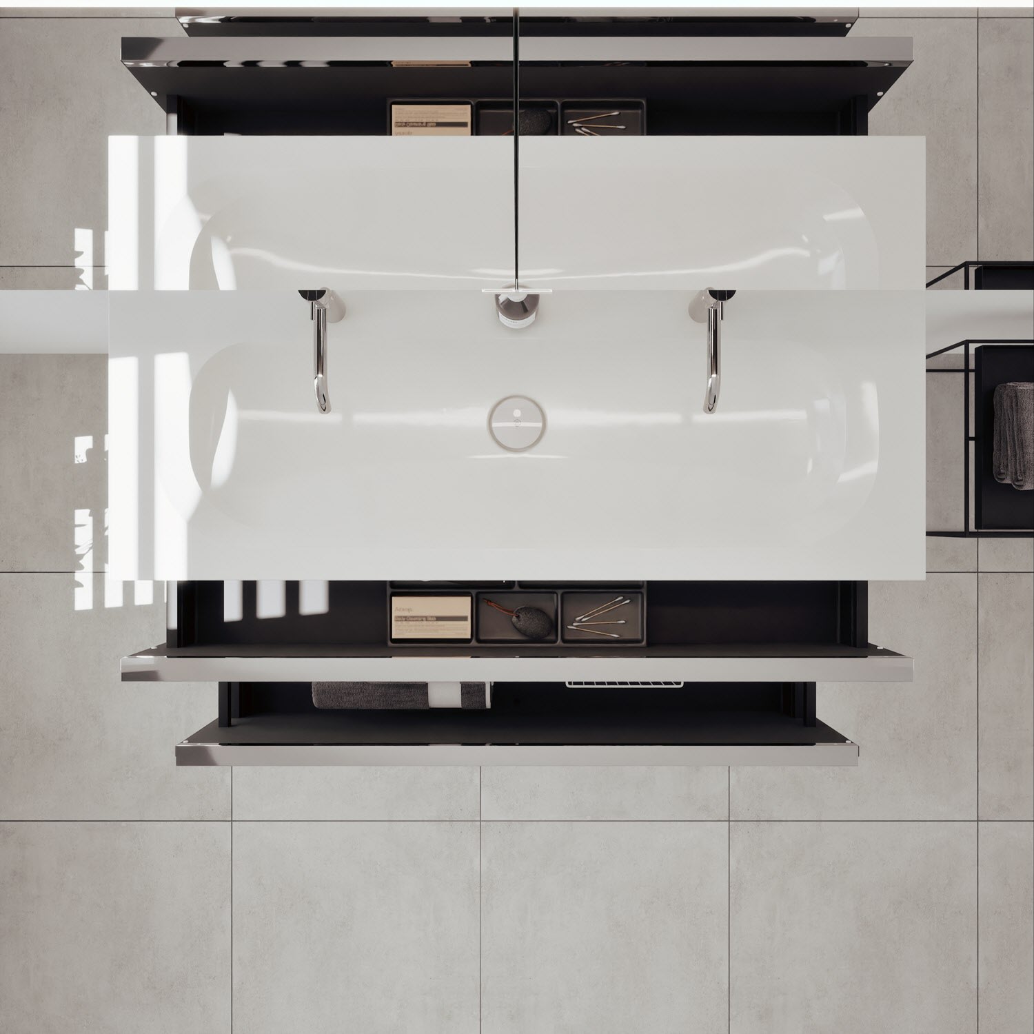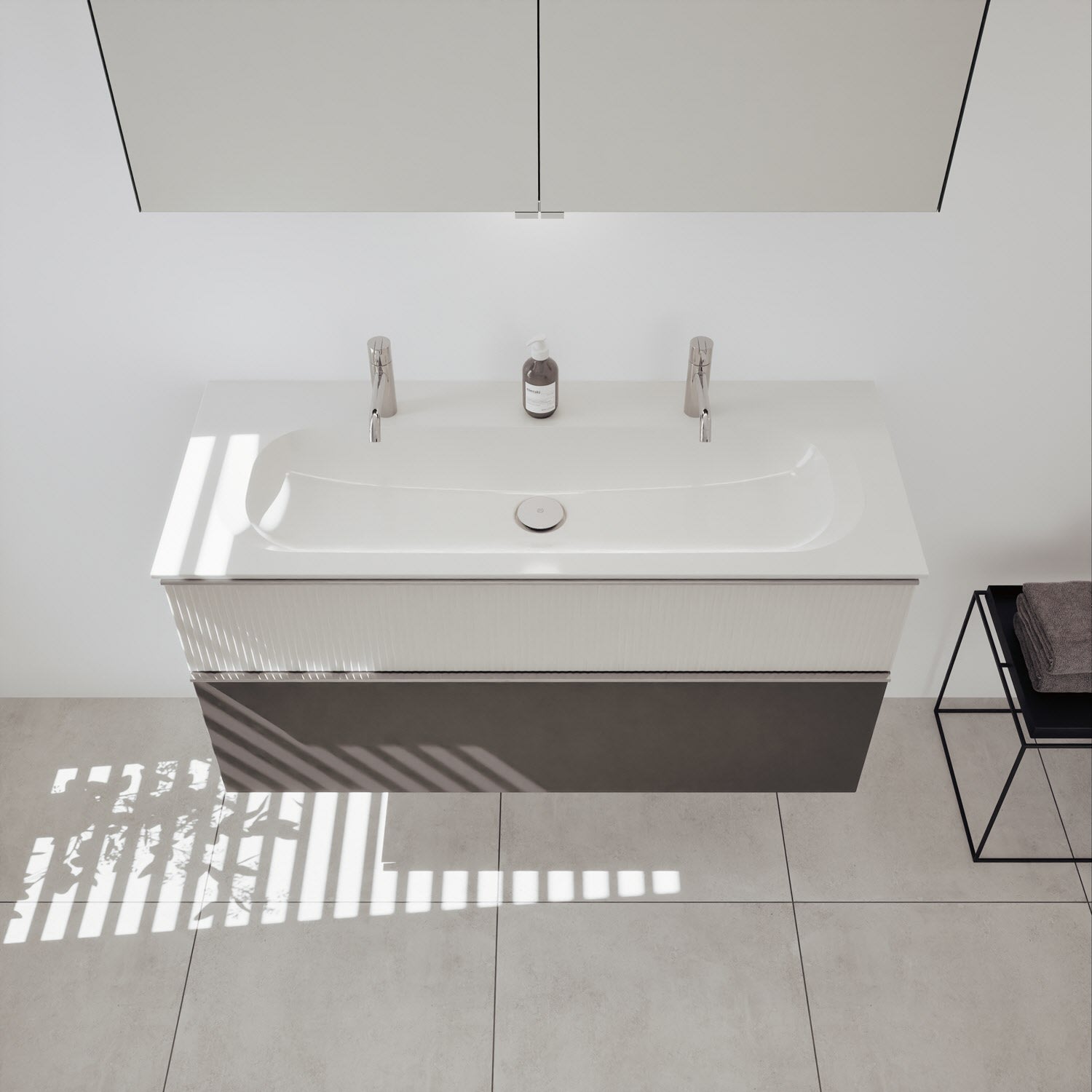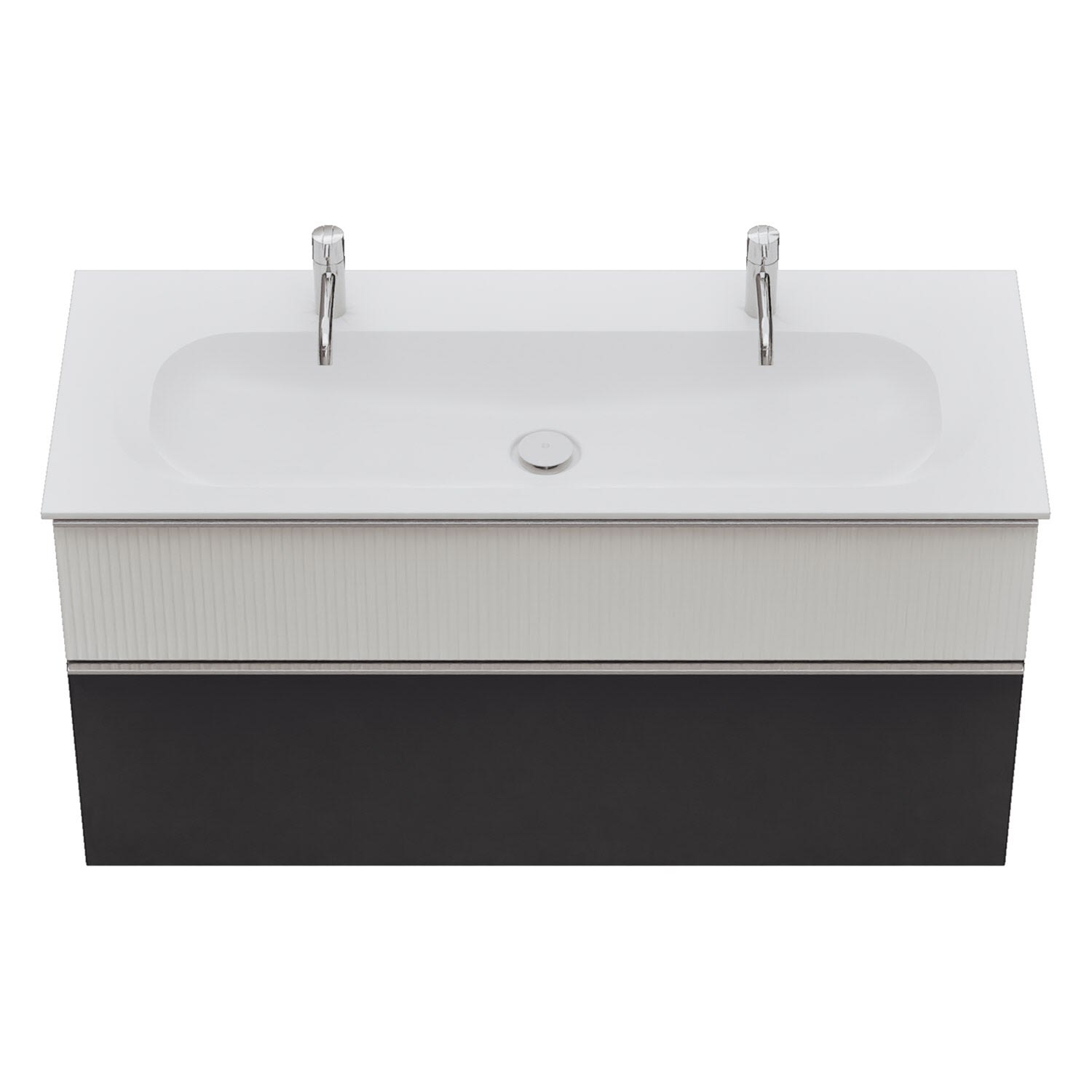 - 1 Schublade oben: 35 cm tief, mit vertikaler Struktur inkl. Siphonausschnitt und Inneneinteilung