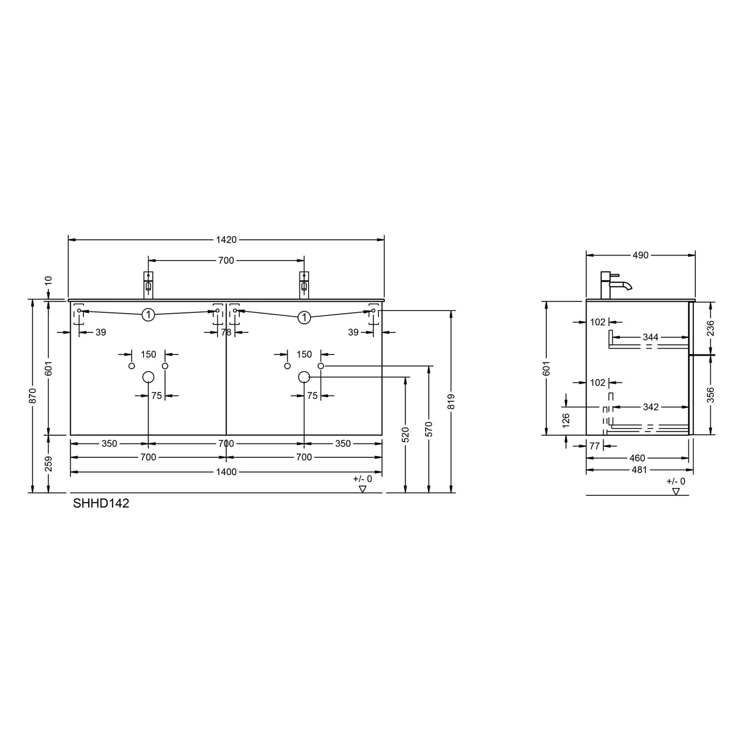 - 2 Schubladen oben, 35 cm tief, mit Siphonausschnitt und Inneneinteilung