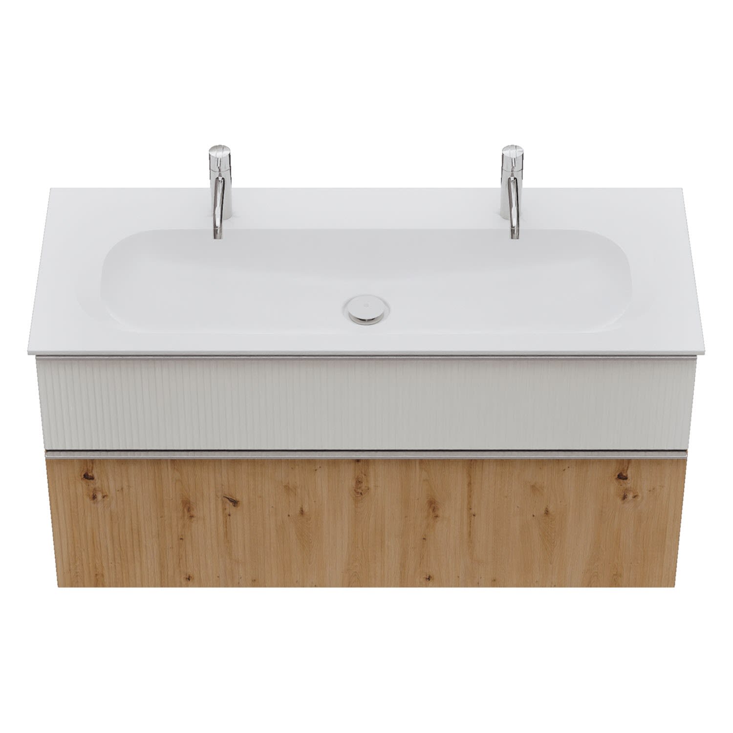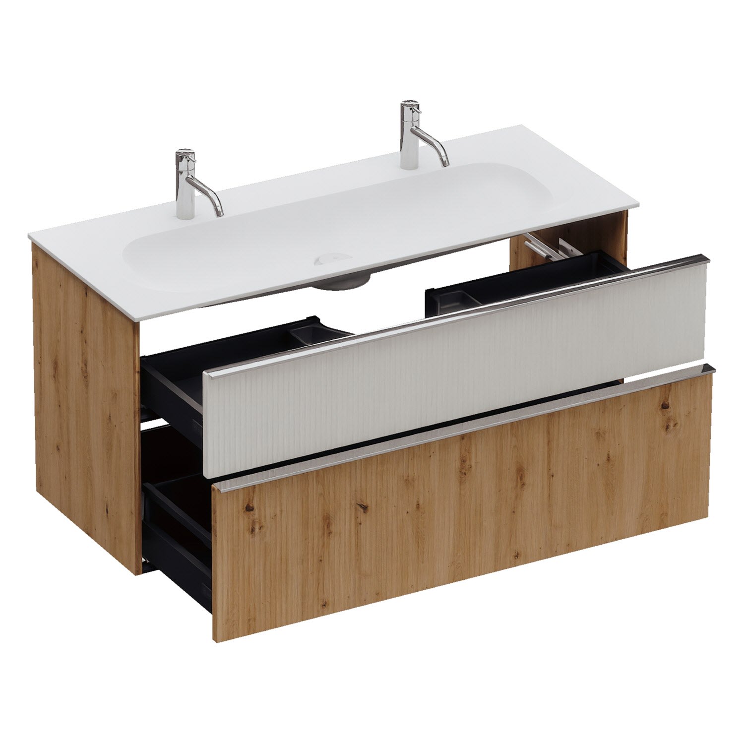 - 1 Schublade oben: 35 cm tief, mit vertikaler Struktur inkl. Siphonausschnitt und Inneneinteilung