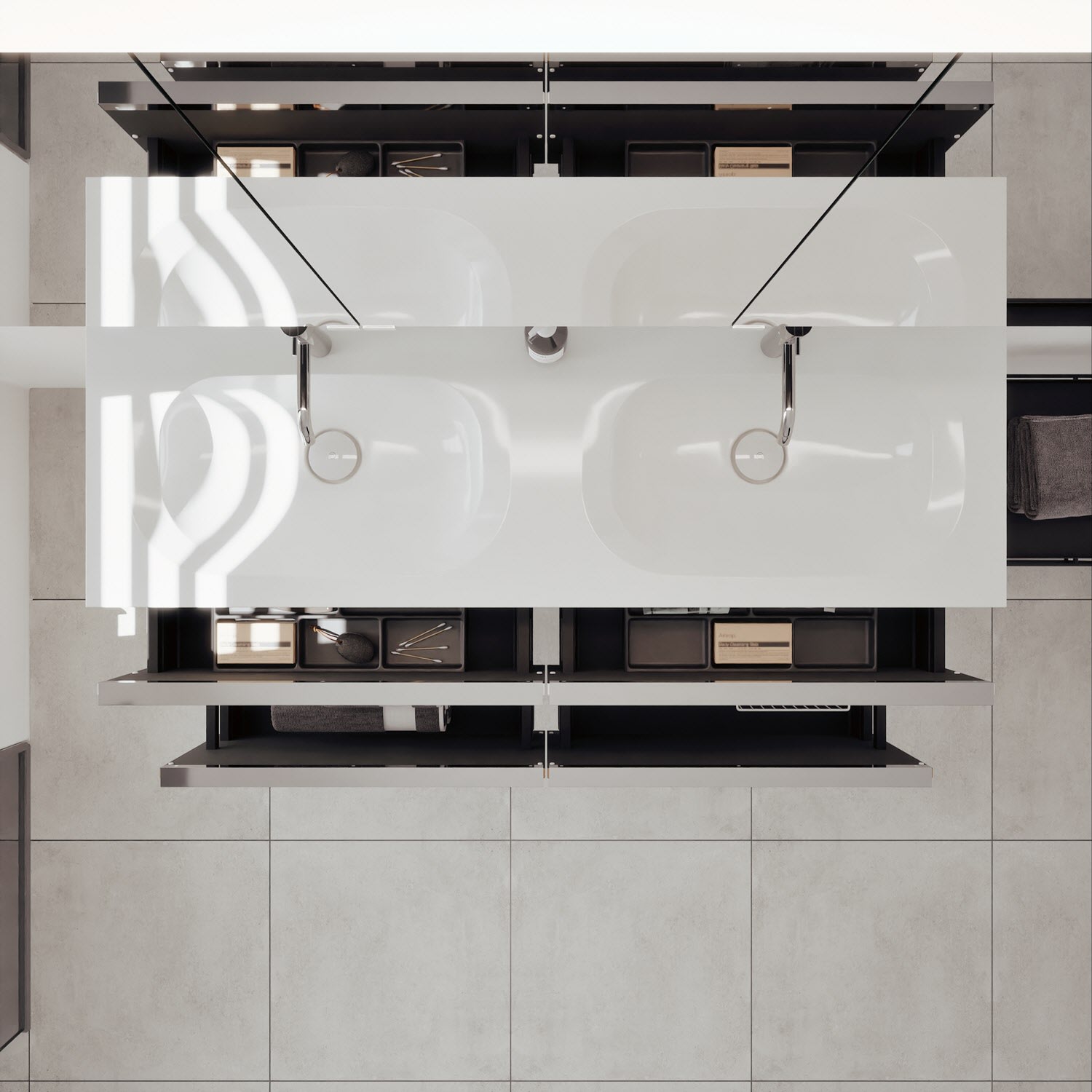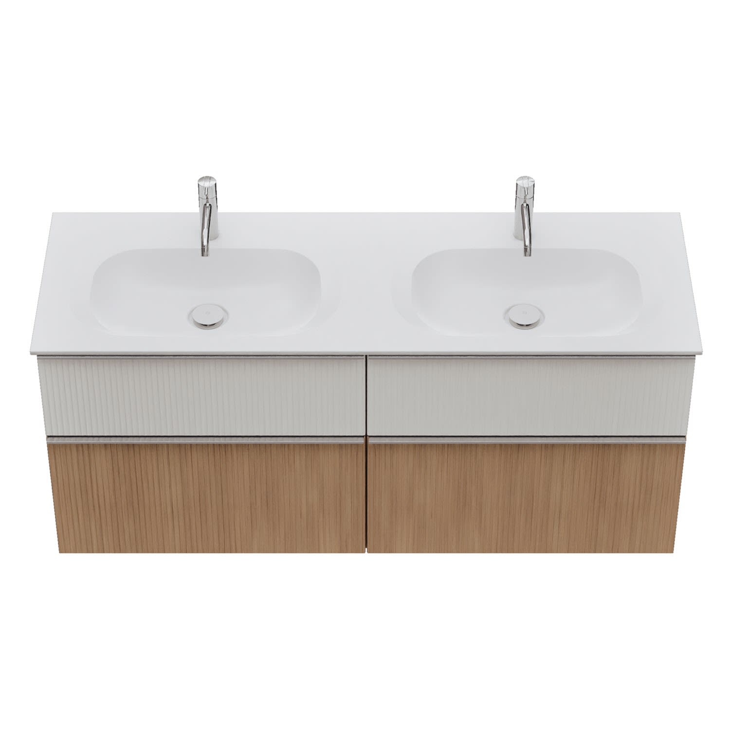 - 2 Schubladen oben, 35 cm tief, mit vertikaler Struktur inkl. mit Siphonausschnitt und Inneneinteilung