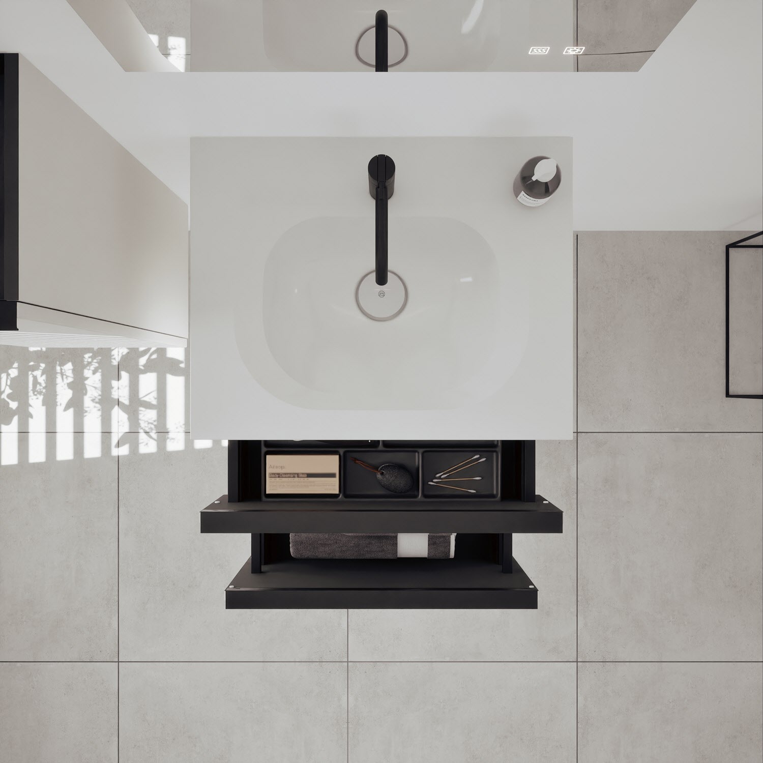 - 1 Schublade oben: 35 cm tief, mit Siphonausschnitt und Inneneinteilung