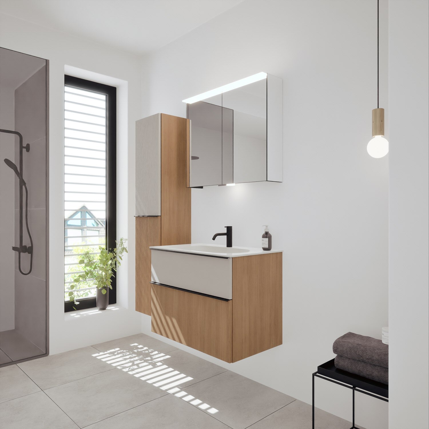 burgbad Fiumo 2.0 Spiegelschrank 80,6 cm mit LED-Aufsatzleuchte und Waschplatzbeleuchtung, 2 Spiegeltüren