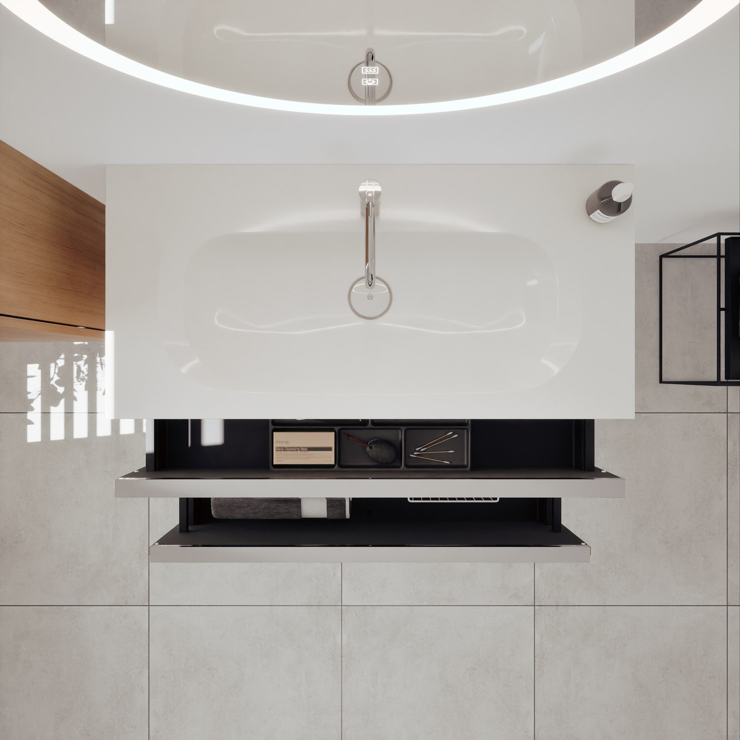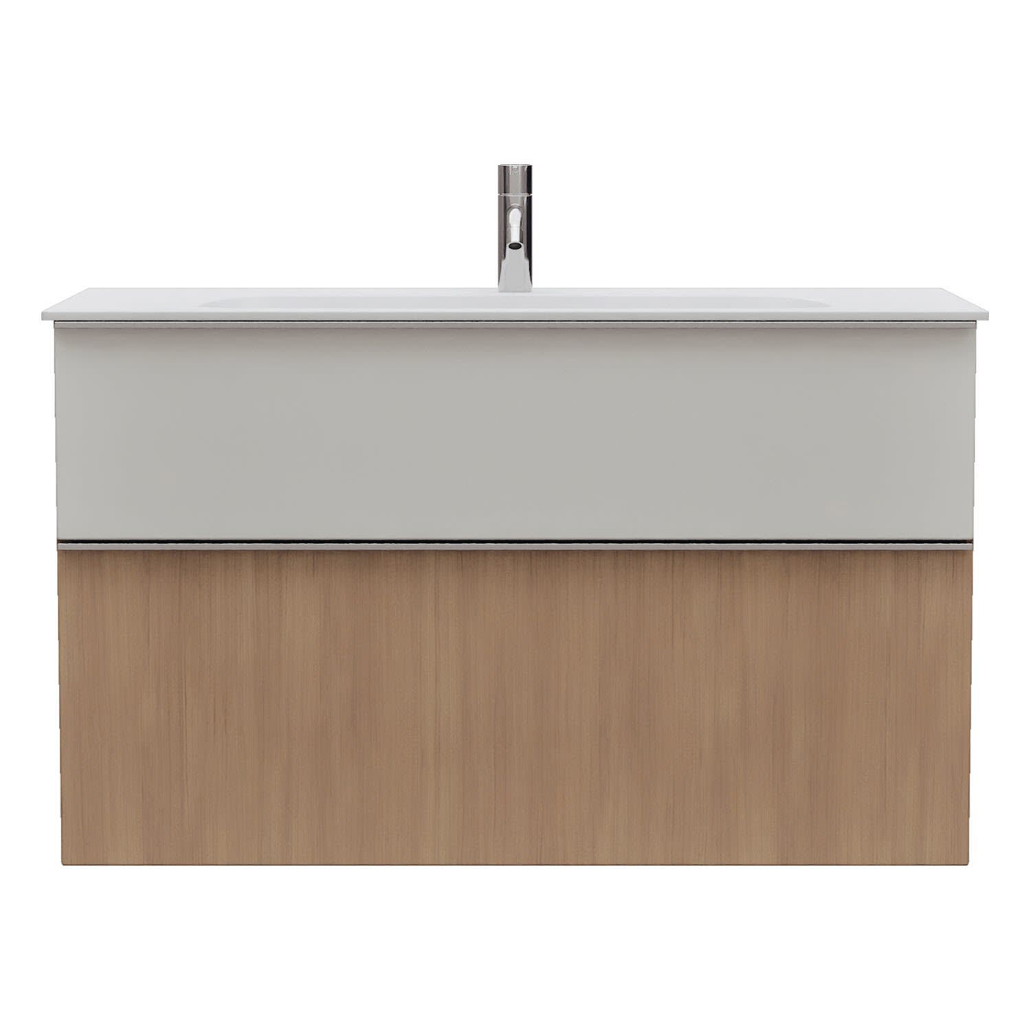 - 1 Schublade oben, 35 cm tief, mit Siphonausschnitt und Inneneinteilung