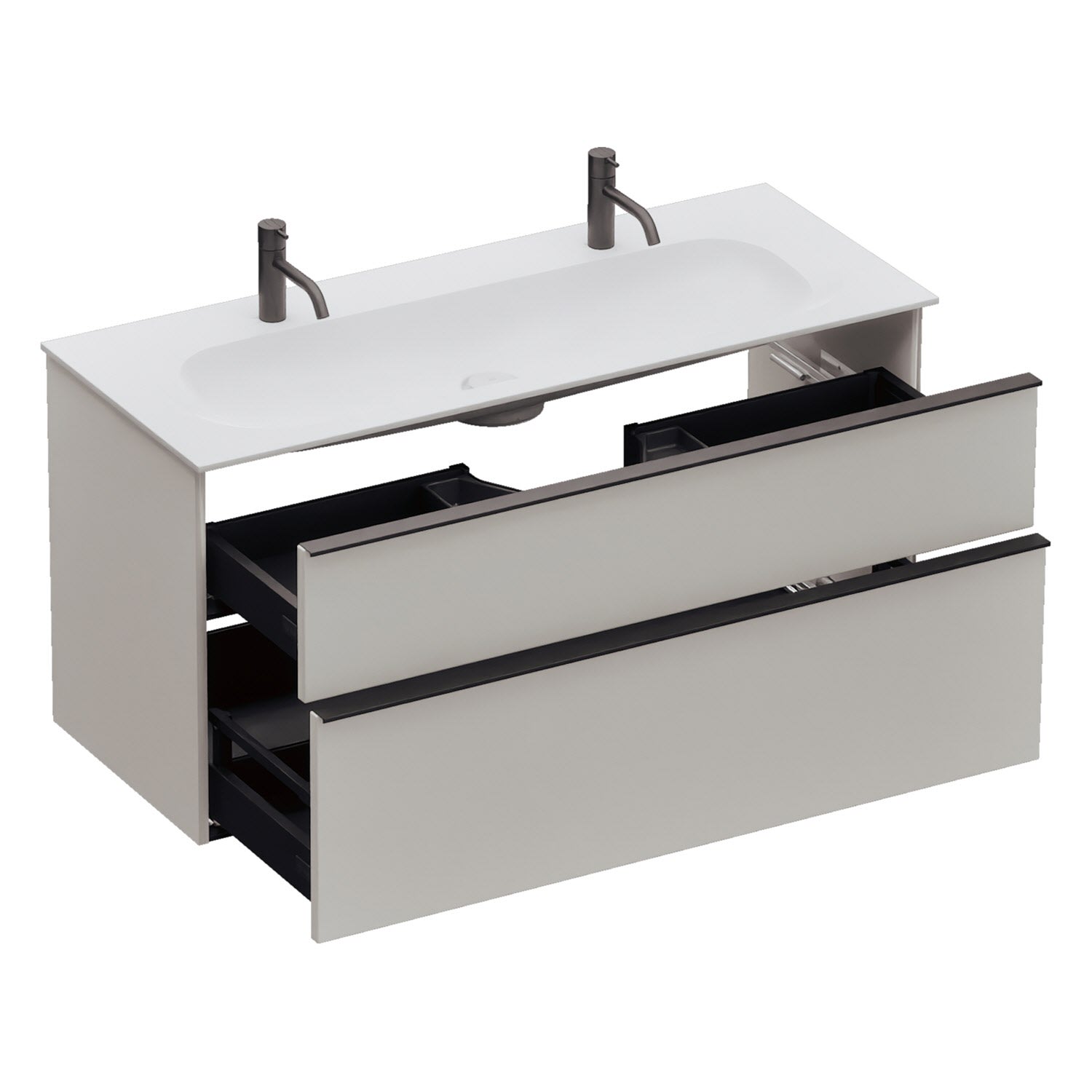 - 1 Schublade oben, 35 cm tief, mit Siphonausschnitt und Inneneinteilung