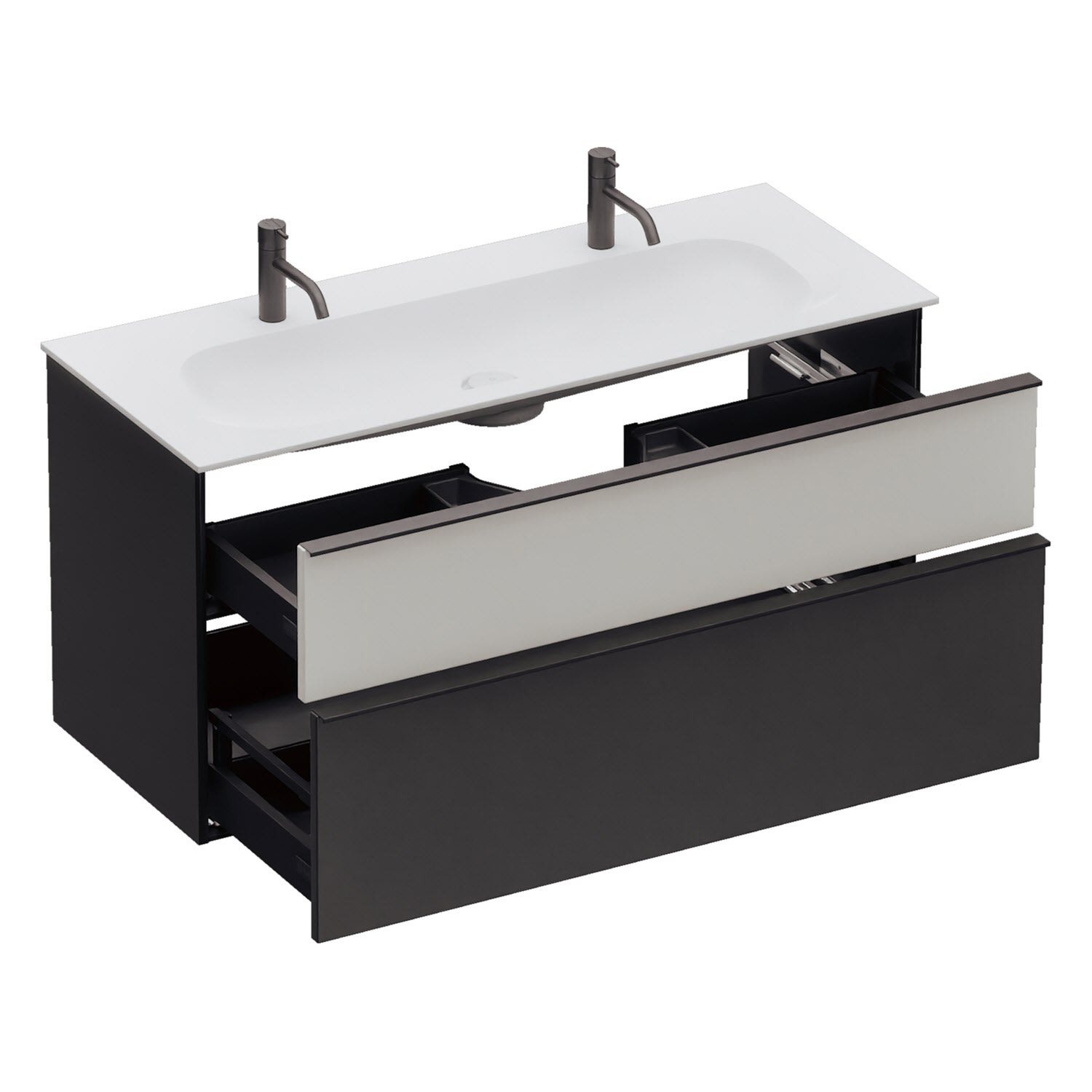 - 1 Schublade oben, 35 cm tief, mit Siphonausschnitt und Inneneinteilung