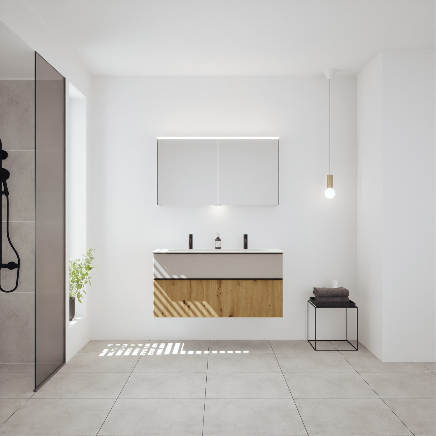 burgbad Fiumo 2.0 Spiegelschrank 120,6 cm mit LED-Aufsatzleuchte und Waschplatzbeleuchtung, 2 Spiegeltüren