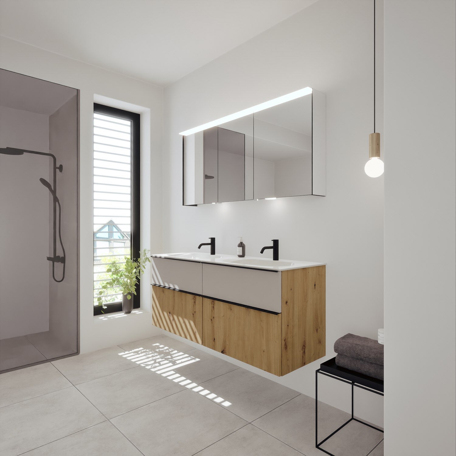 burgbad Fiumo 2.0 Spiegelschrank 140,6 cm mit LED-Aufsatzleuchte und Waschplatzbeleuchtung, 3 Spiegeltüren