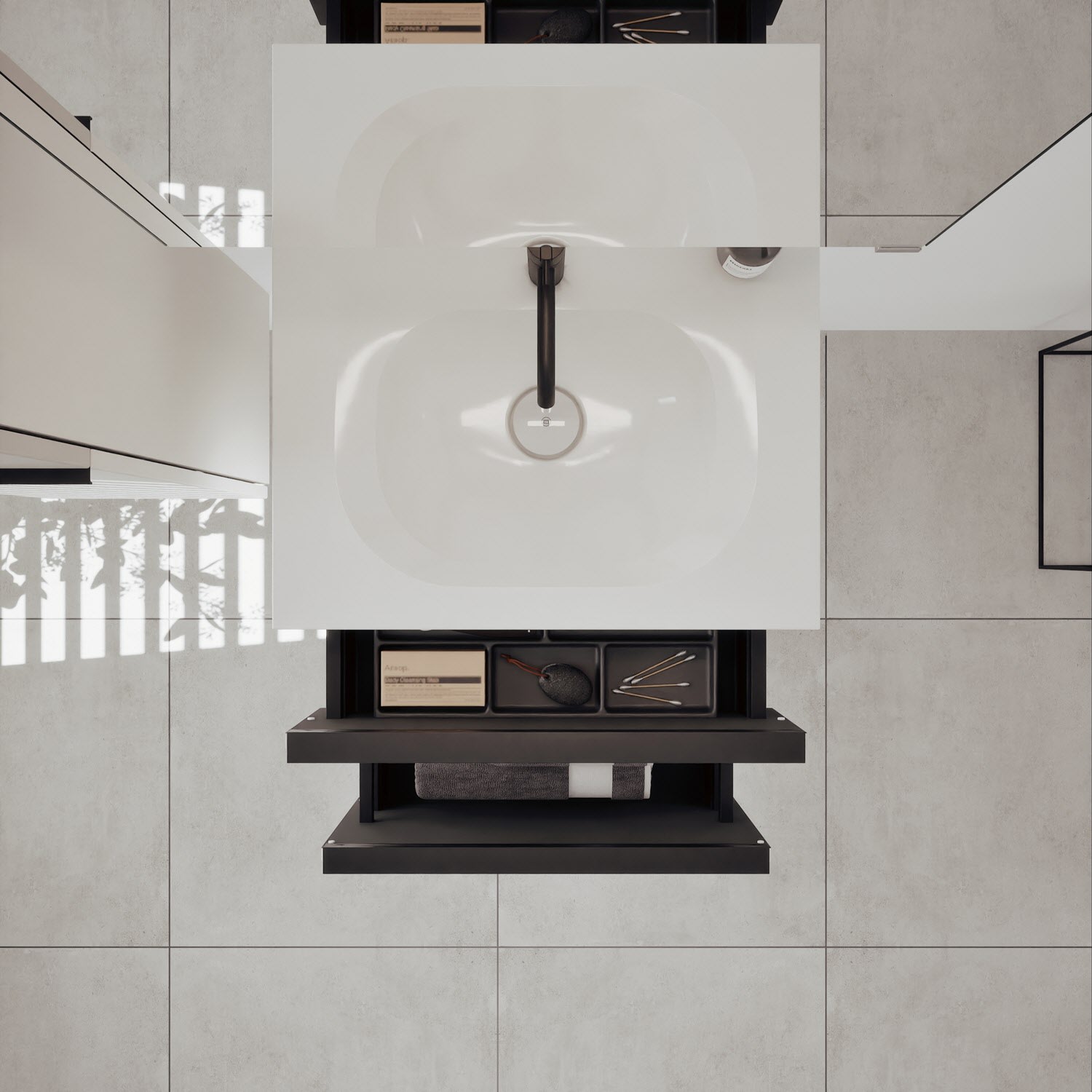 - 1 Schublade oben, 35 cm tief, mit Siphonausschnitt und Inneneinteilung