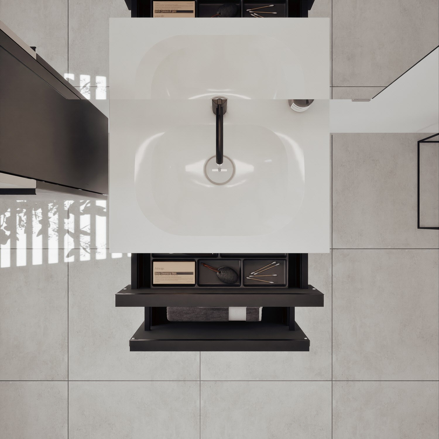 - 1 Schublade oben, 35 cm tief, mit Siphonausschnitt und Inneneinteilung