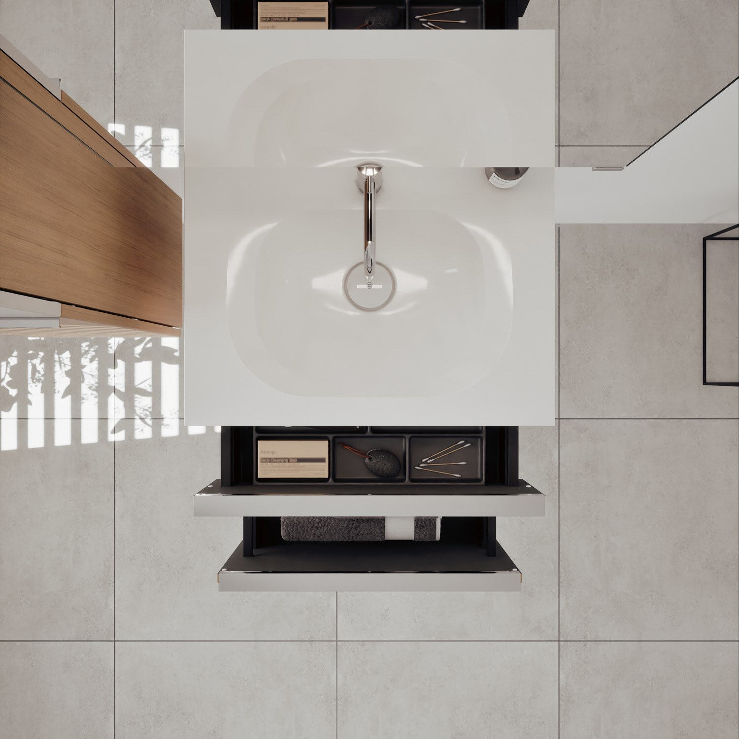 - 1 Schublade oben, 35 cm tief, mit Siphonausschnitt und Inneneinteilung