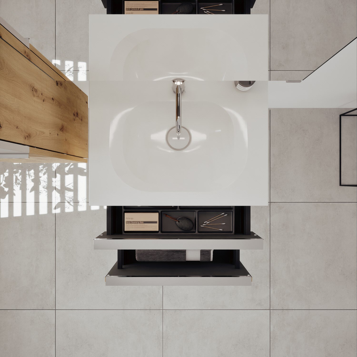 - 1 Schublade oben, 35 cm tief, mit Siphonausschnitt und Inneneinteilung