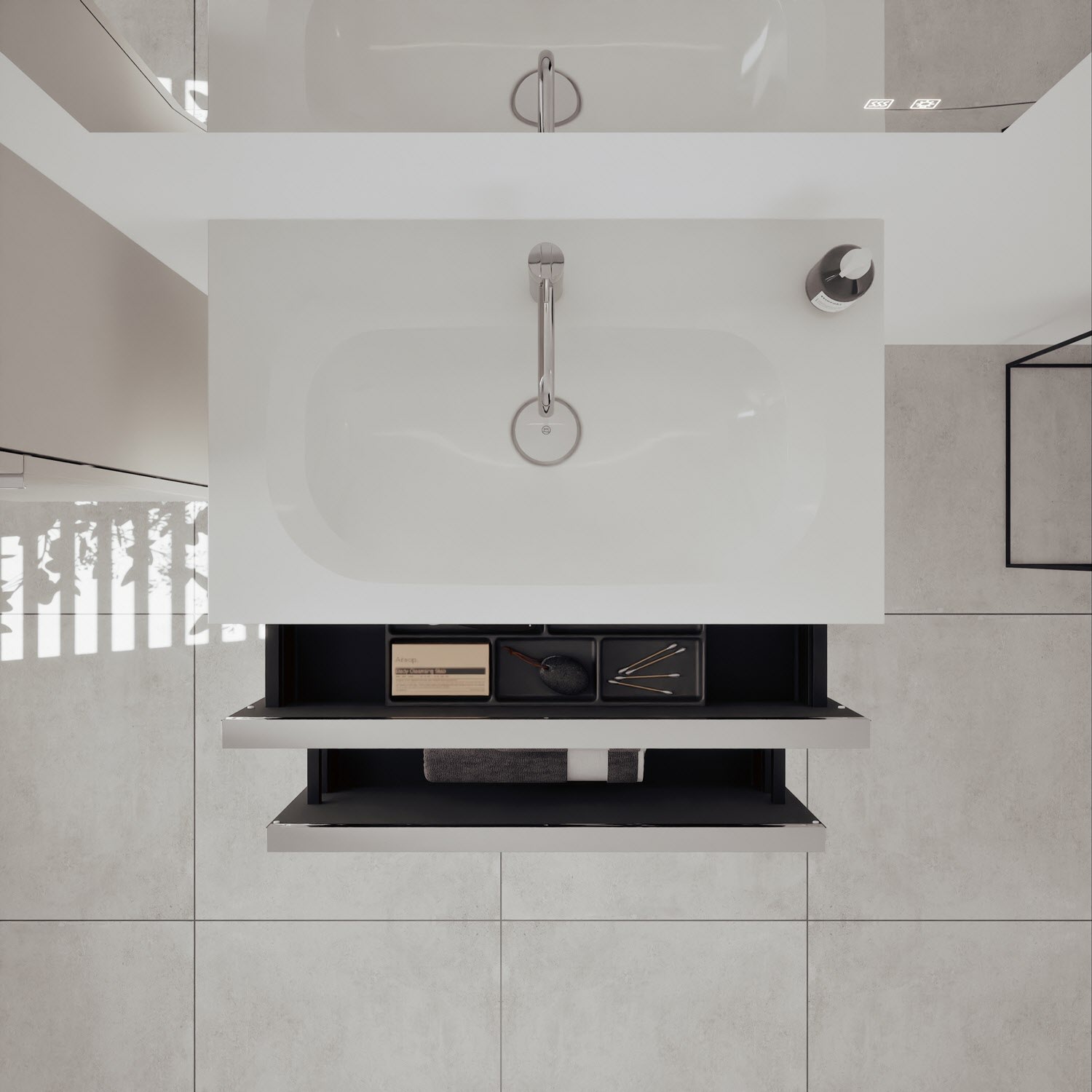- 1 Schublade oben, 35 cm tief, mit vertikaler Struktur inkl. Siphonausschnitt und Inneneinteilung