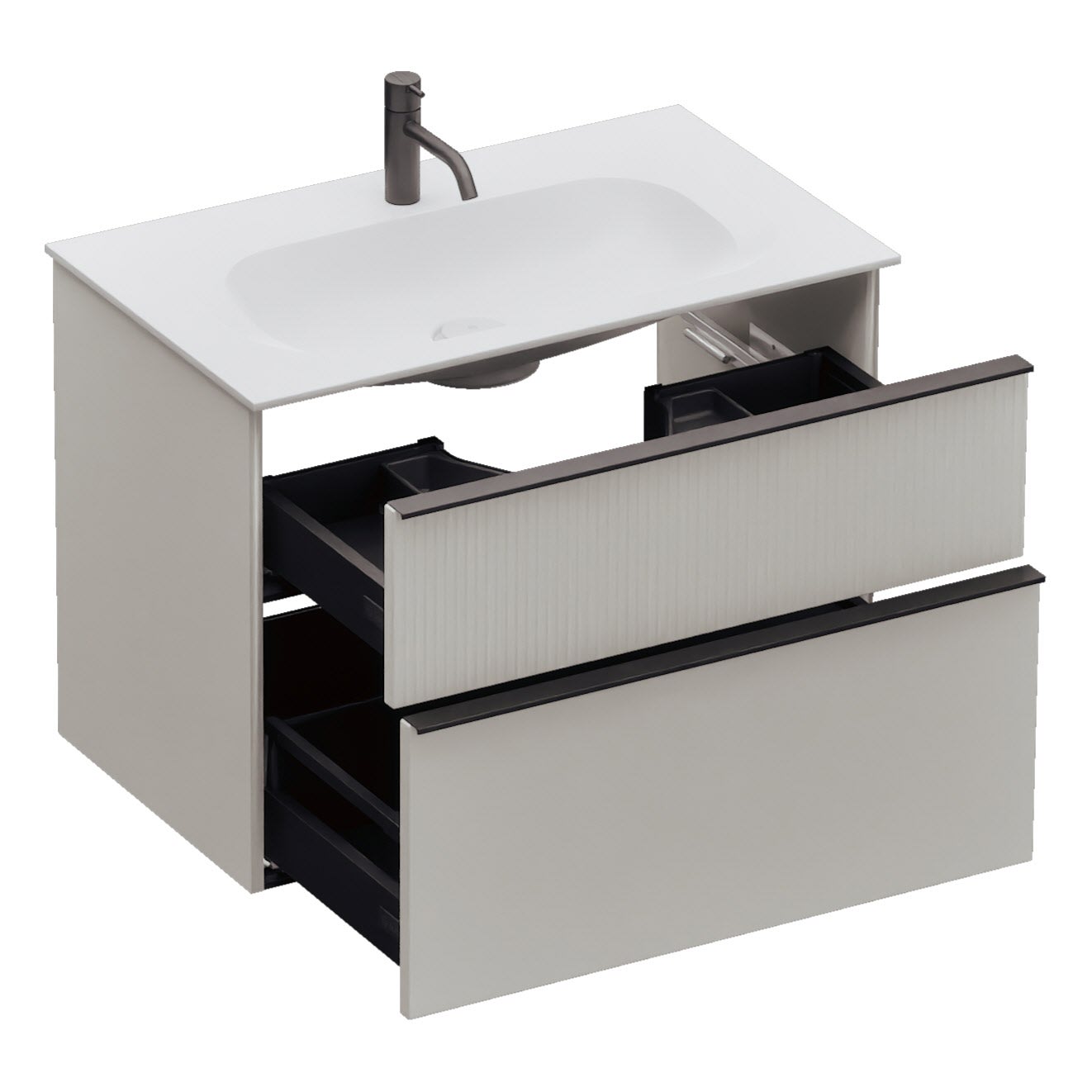 - 1 Schublade oben, 35 cm tief, mit vertikaler Struktur inkl. Siphonausschnitt und Inneneinteilung