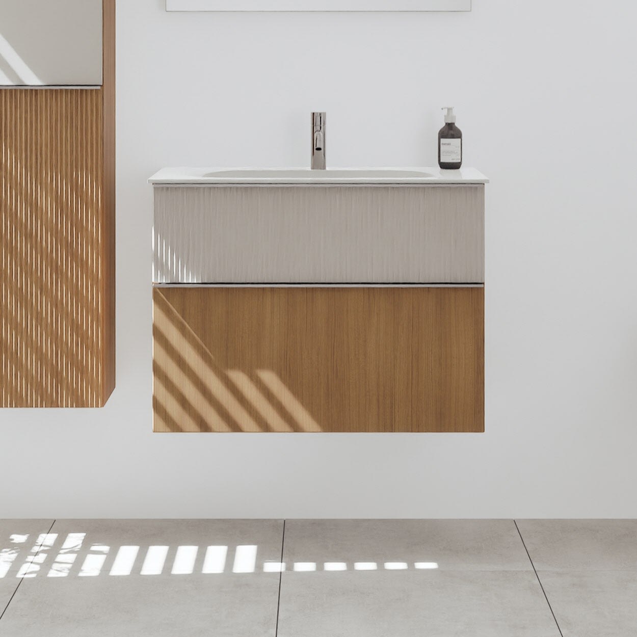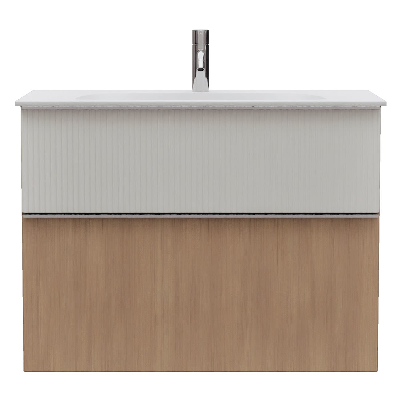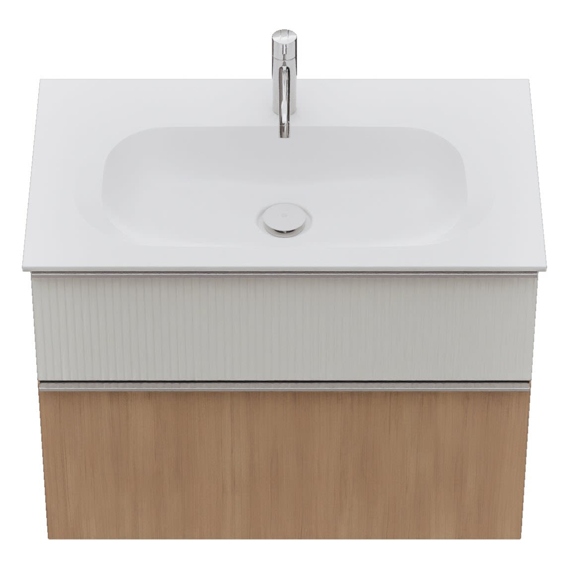 - 1 Schublade oben, 35 cm tief, mit vertikaler Struktur inkl. Siphonausschnitt und Inneneinteilung