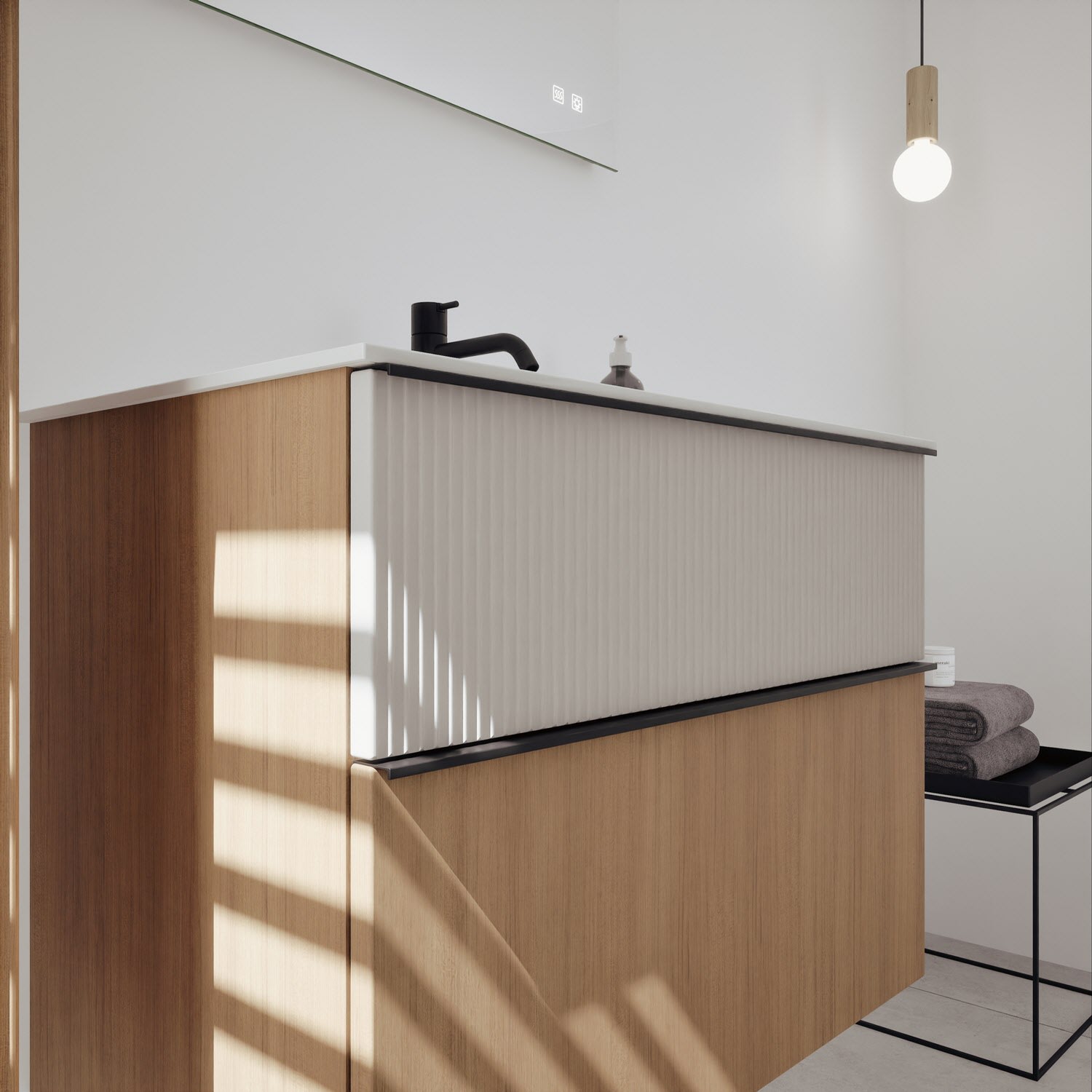 - 1 Schublade oben, 35 cm tief, mit vertikaler Struktur inkl. Siphonausschnitt und Inneneinteilung