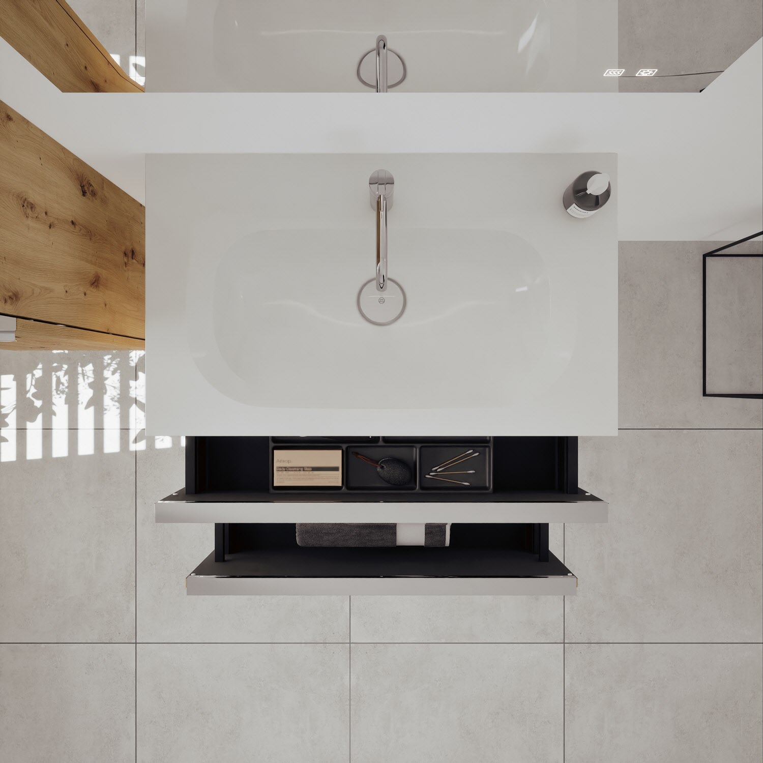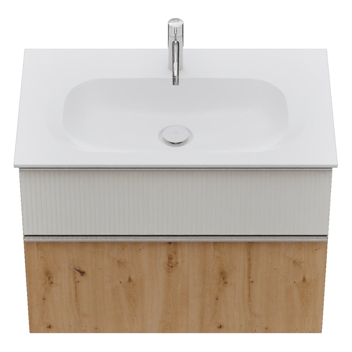 - 1 Schublade oben, 35 cm tief, mit vertikaler Struktur inkl. Siphonausschnitt und Inneneinteilung