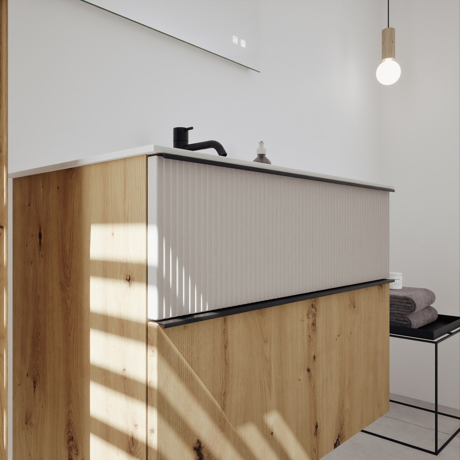 - 1 Schublade oben, 35 cm tief, mit vertikaler Struktur inkl. Siphonausschnitt und Inneneinteilung