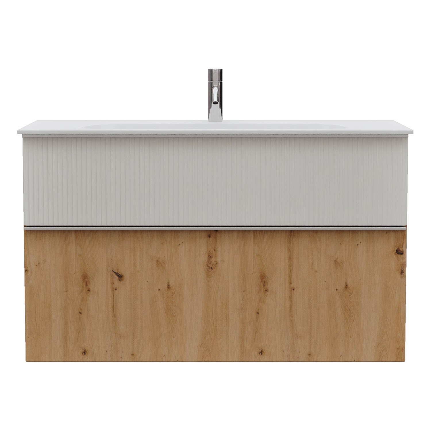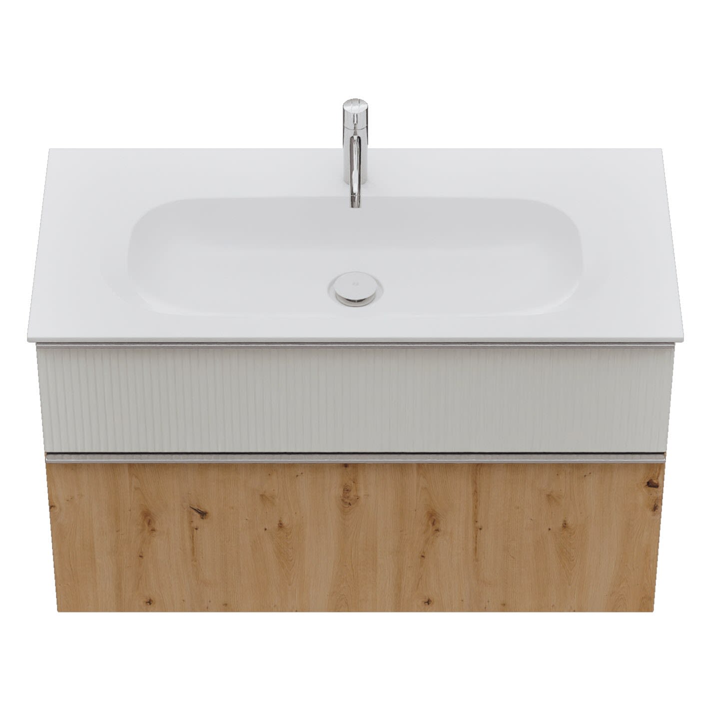 - 1 Schublade oben, 35 cm tief, mit vertikaler Struktur inkl. Siphonausschnitt und Inneneinteilung
