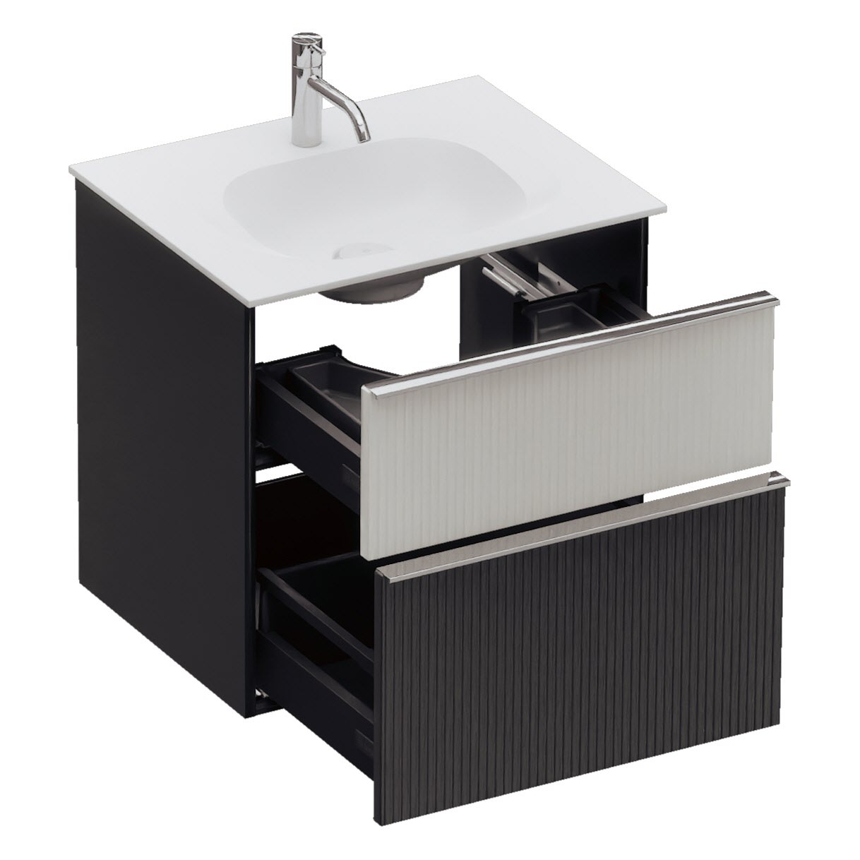 - 1 Schublade oben, 35 cm tief, mit vertikaler Struktur inkl. Siphonausschnitt und Inneneinteilung