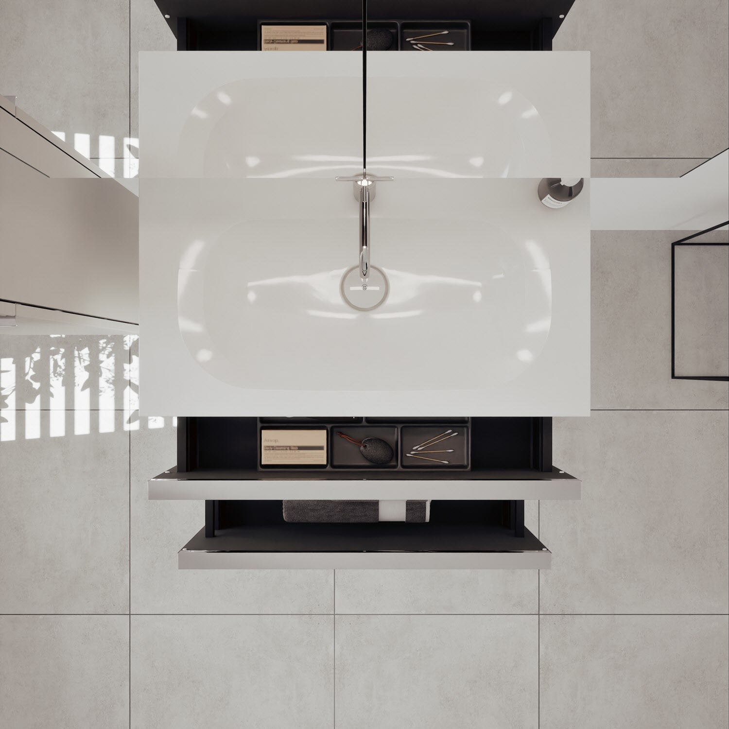 - 1 Schublade oben: 35 cm tief, mit vertikaler Struktur inkl. Siphonausschnitt und Inneneinteilung