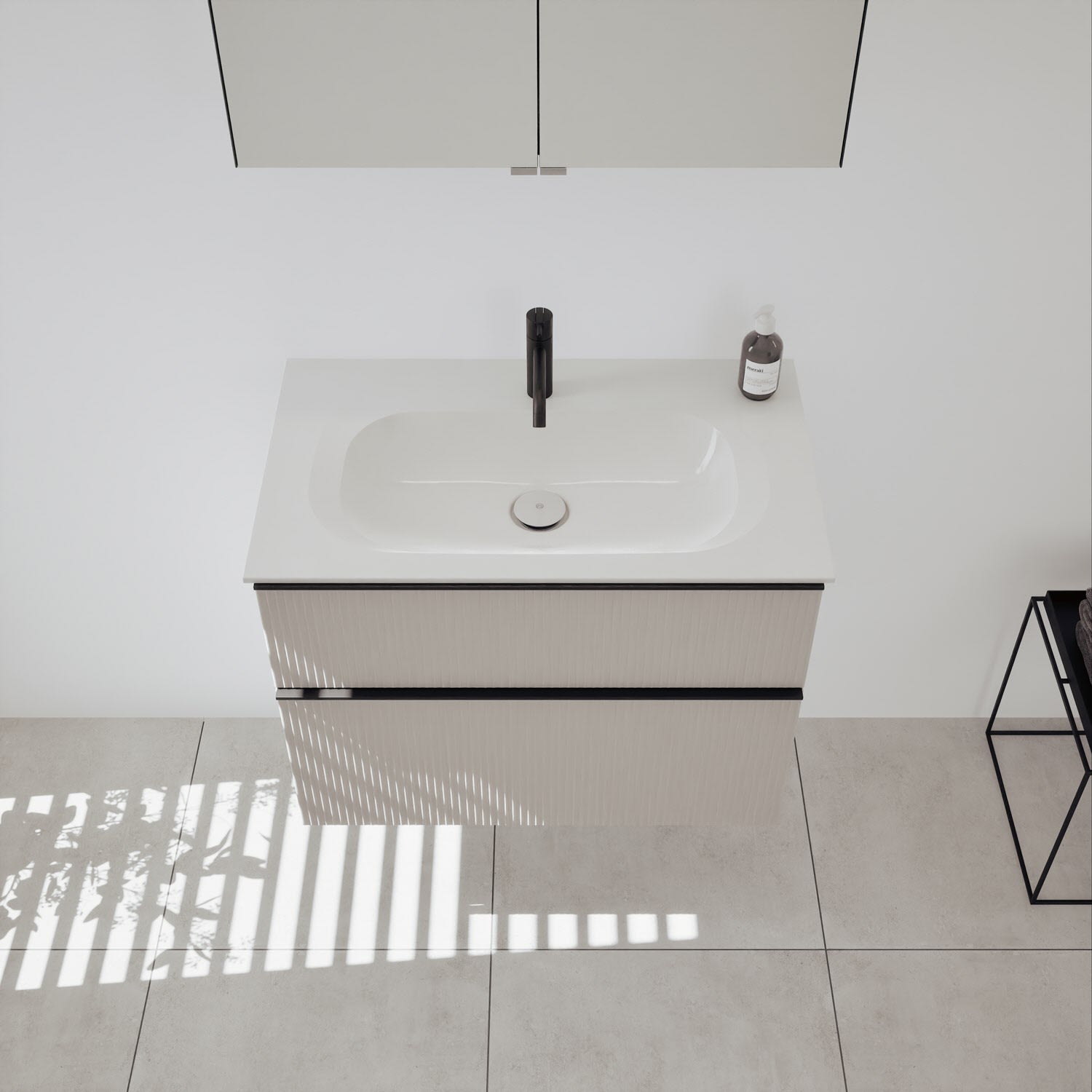 - 1 Schublade oben: 35 cm tief, mit vertikaler Struktur inkl. Siphonausschnitt und Inneneinteilung
