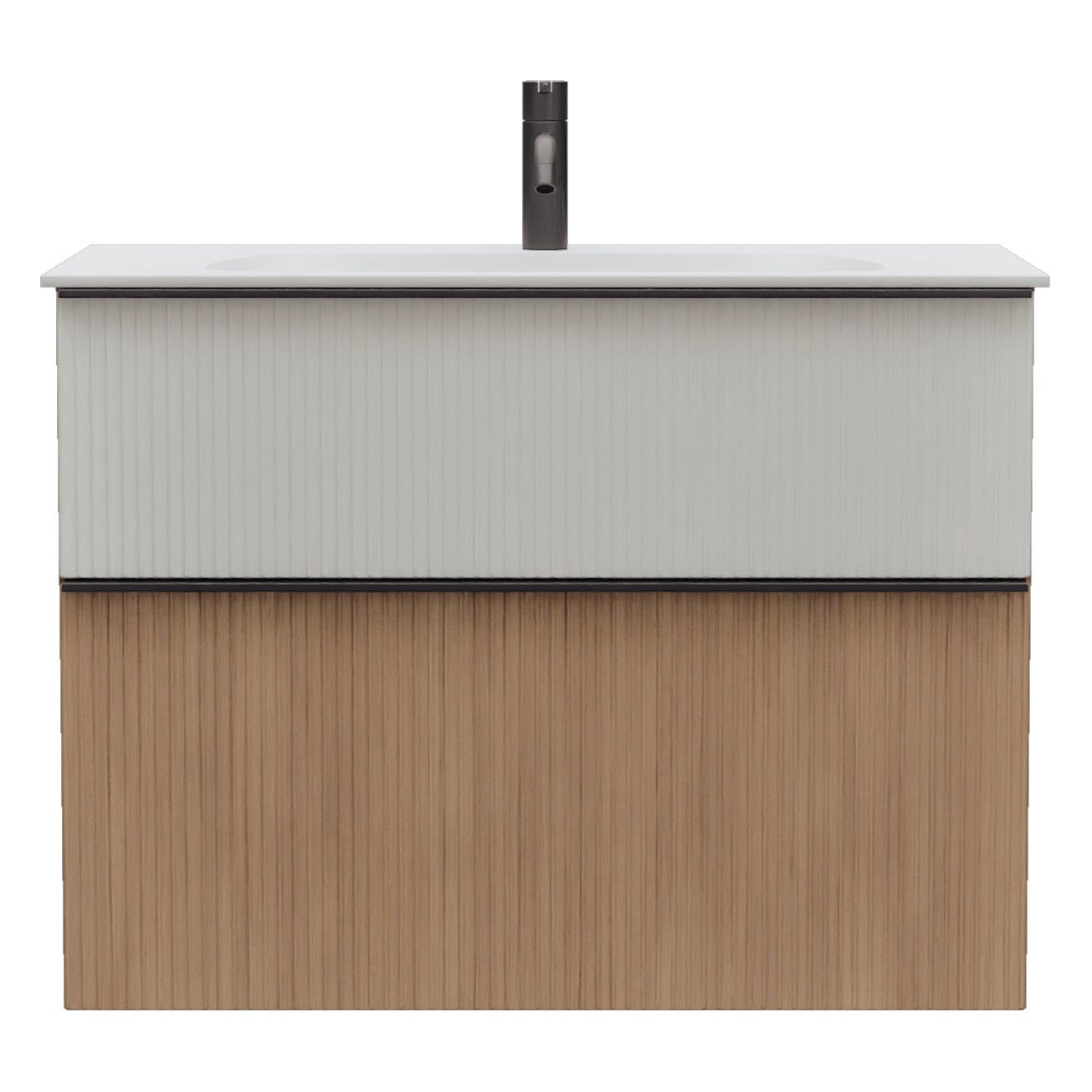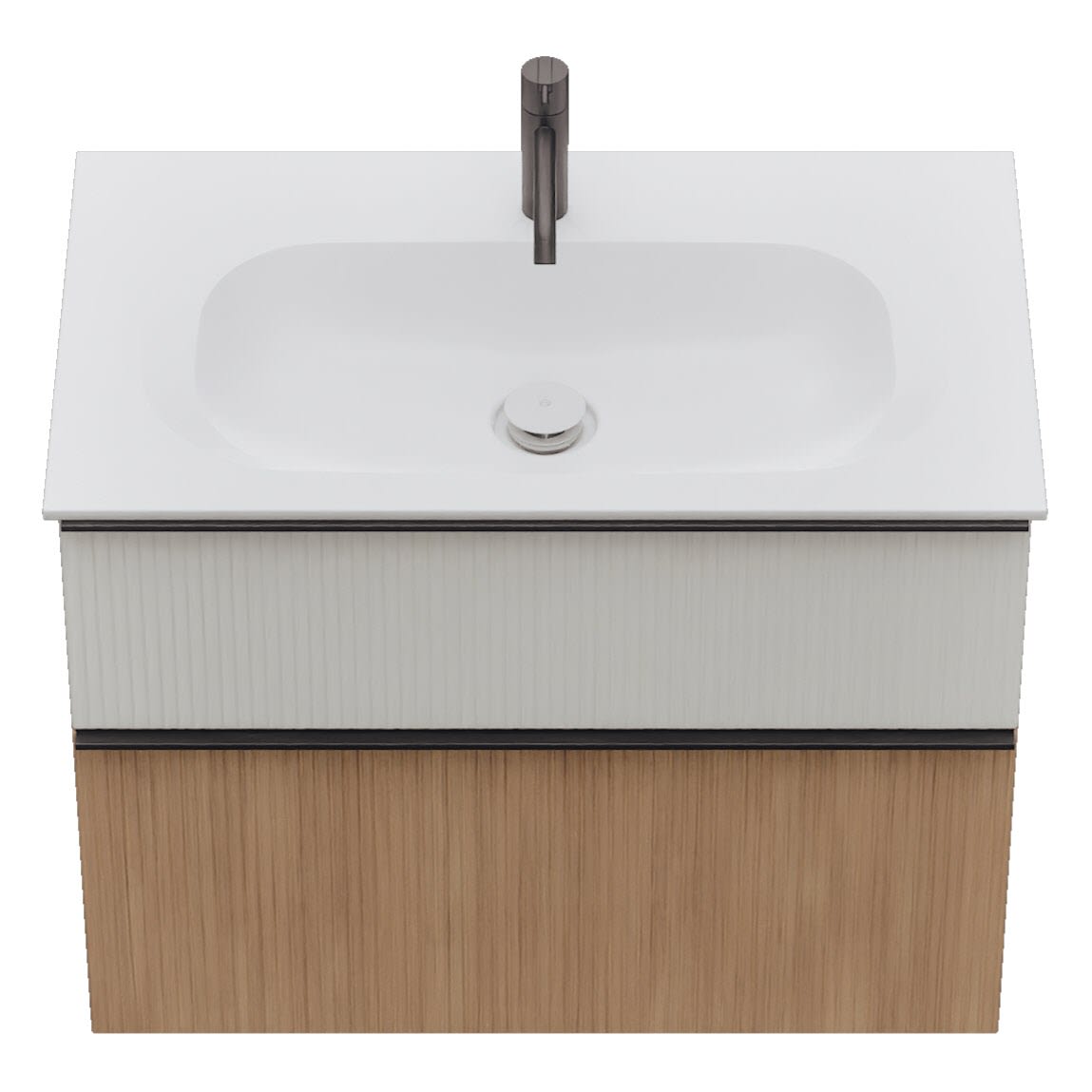 - 1 Schublade oben: 35 cm tief, mit vertikaler Struktur inkl. Siphonausschnitt und Inneneinteilung
