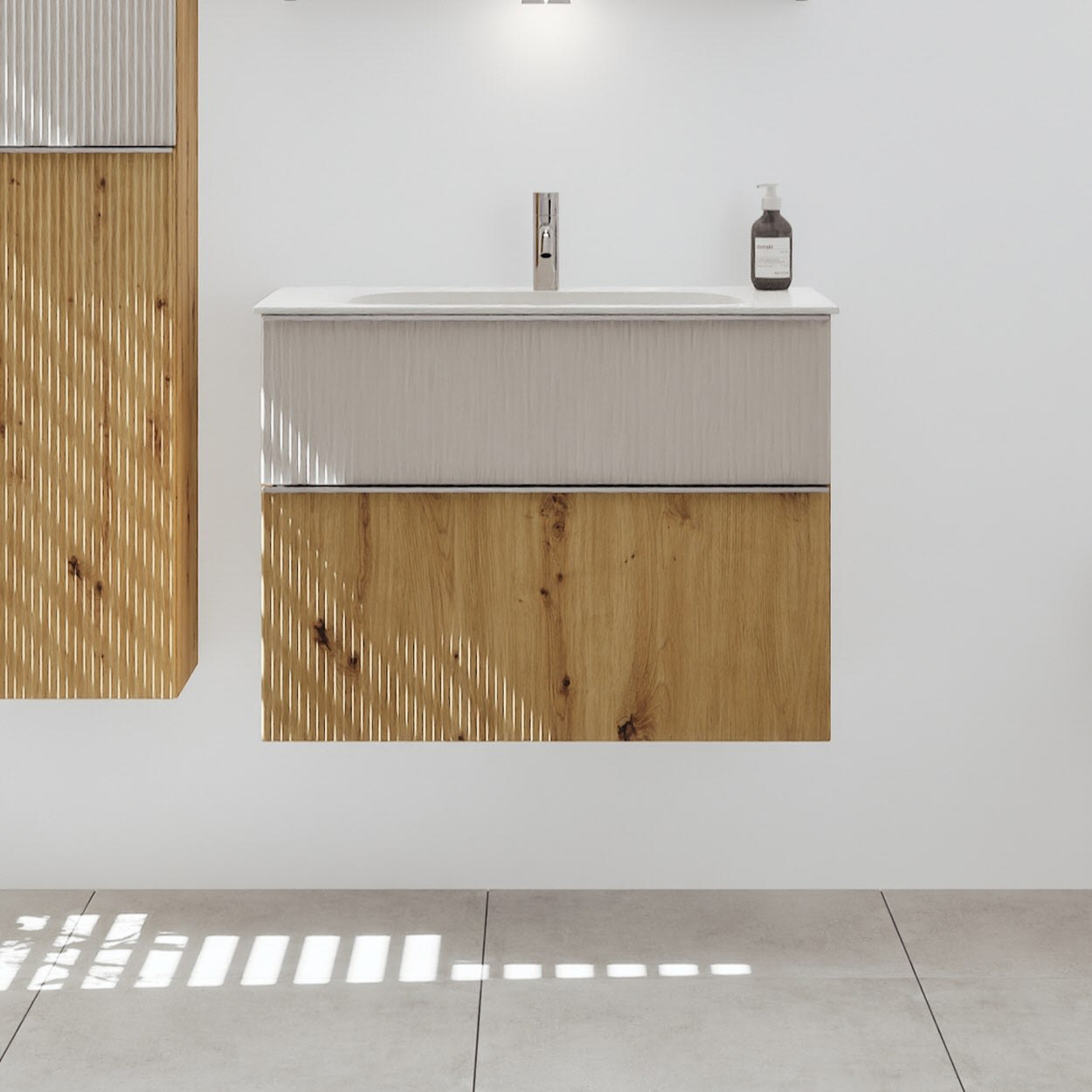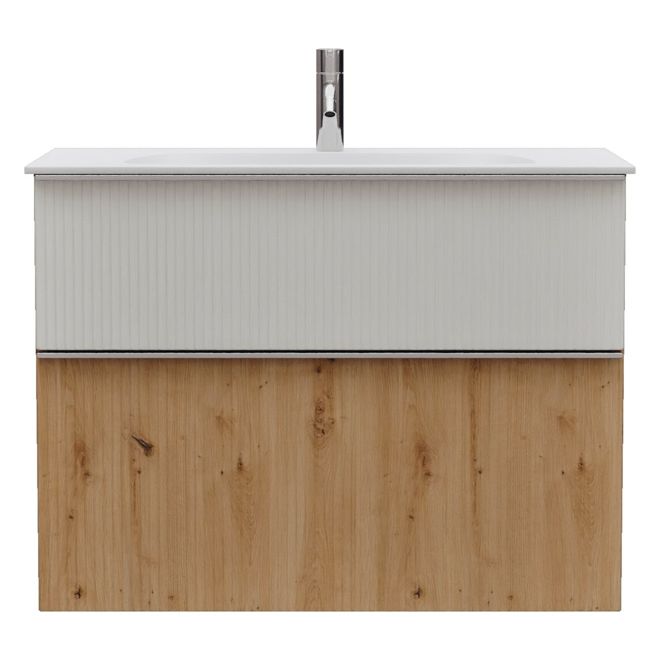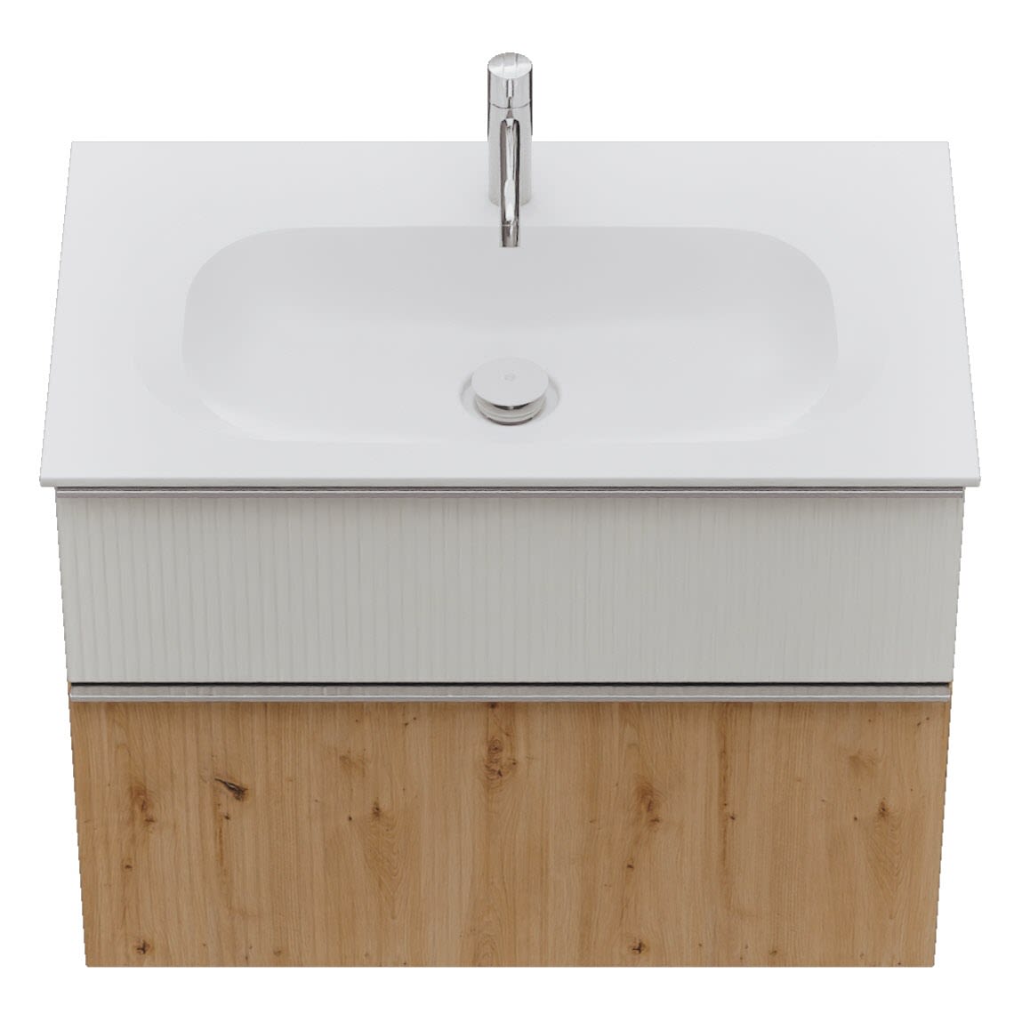 - 1 Schublade oben: 35 cm tief, mit vertikaler Struktur inkl. Siphonausschnitt und Inneneinteilung
