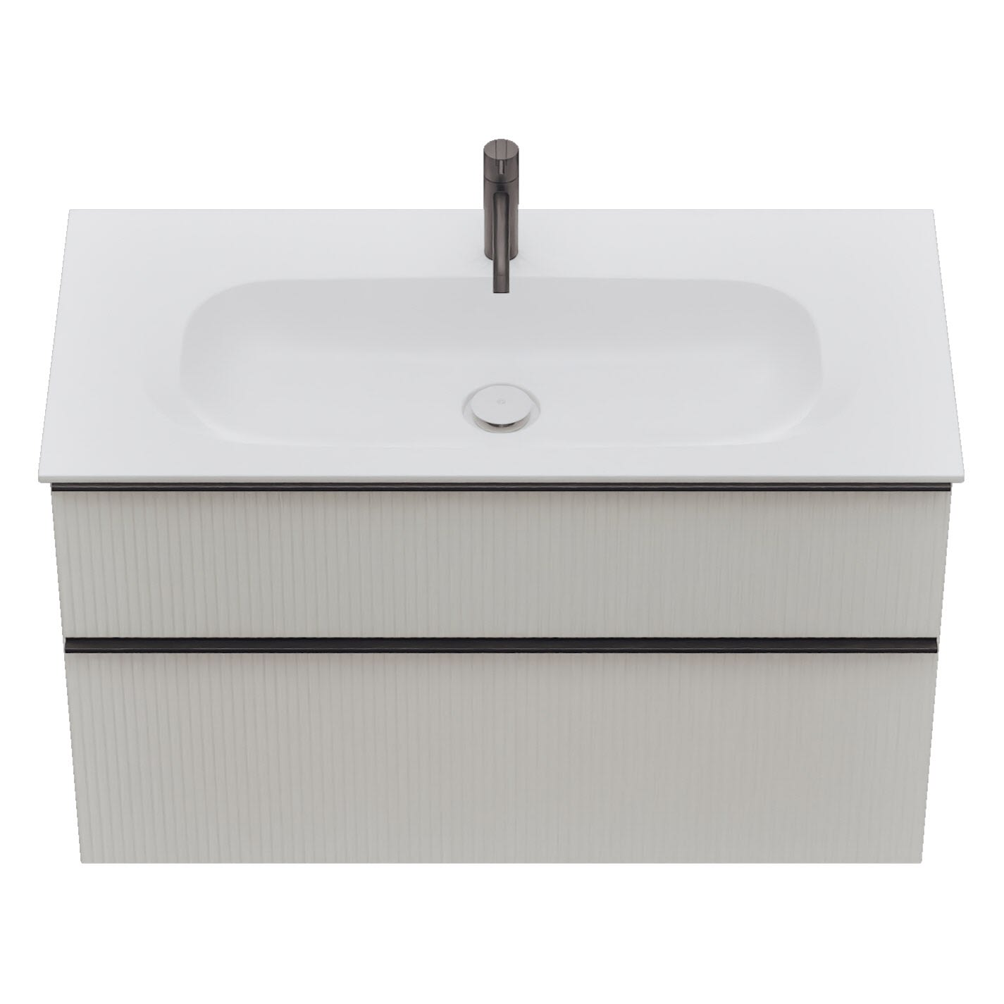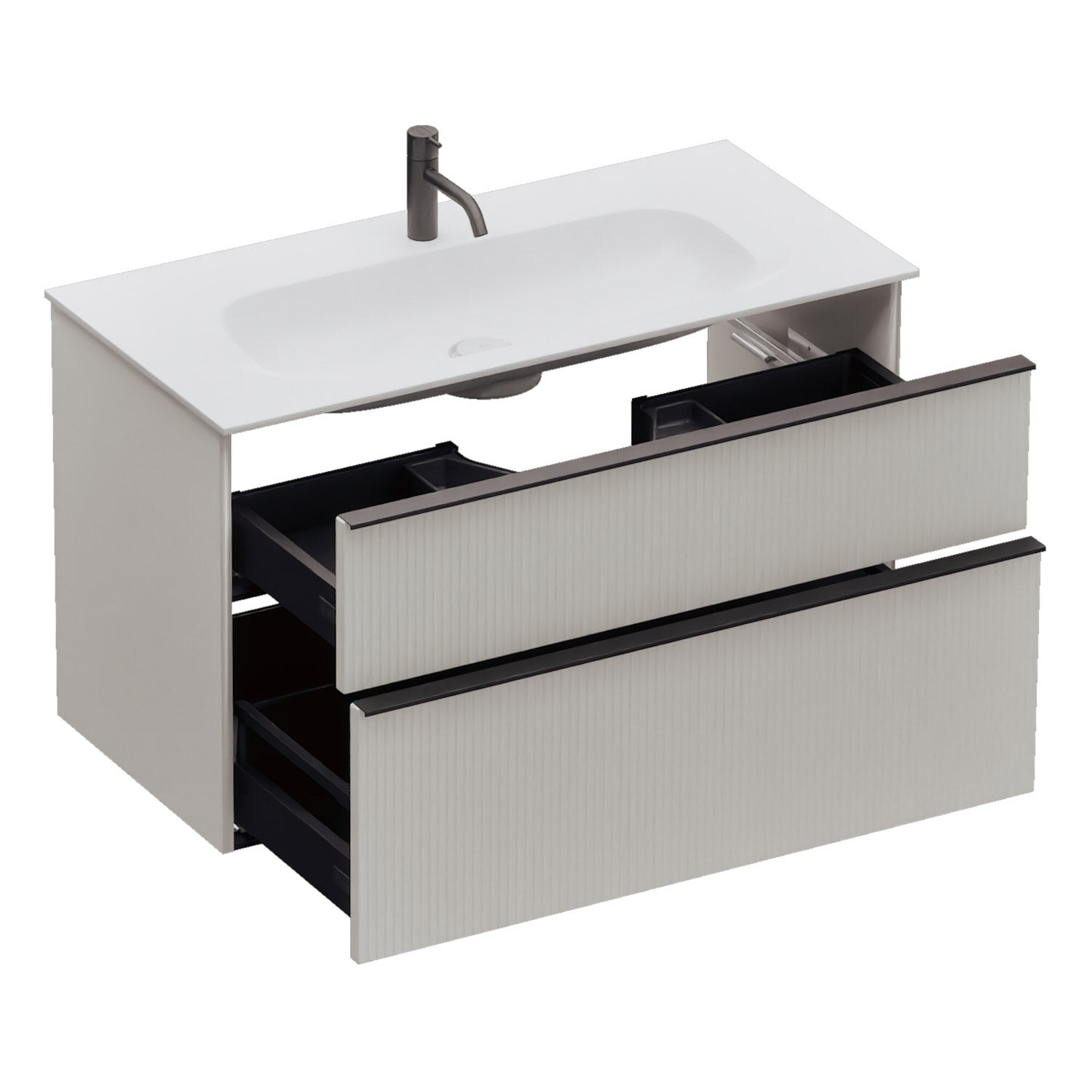 - 1 Schublade oben, 35 cm tief, mit vertikaler Struktur inkl. Siphonausschnitt und Inneneinteilung