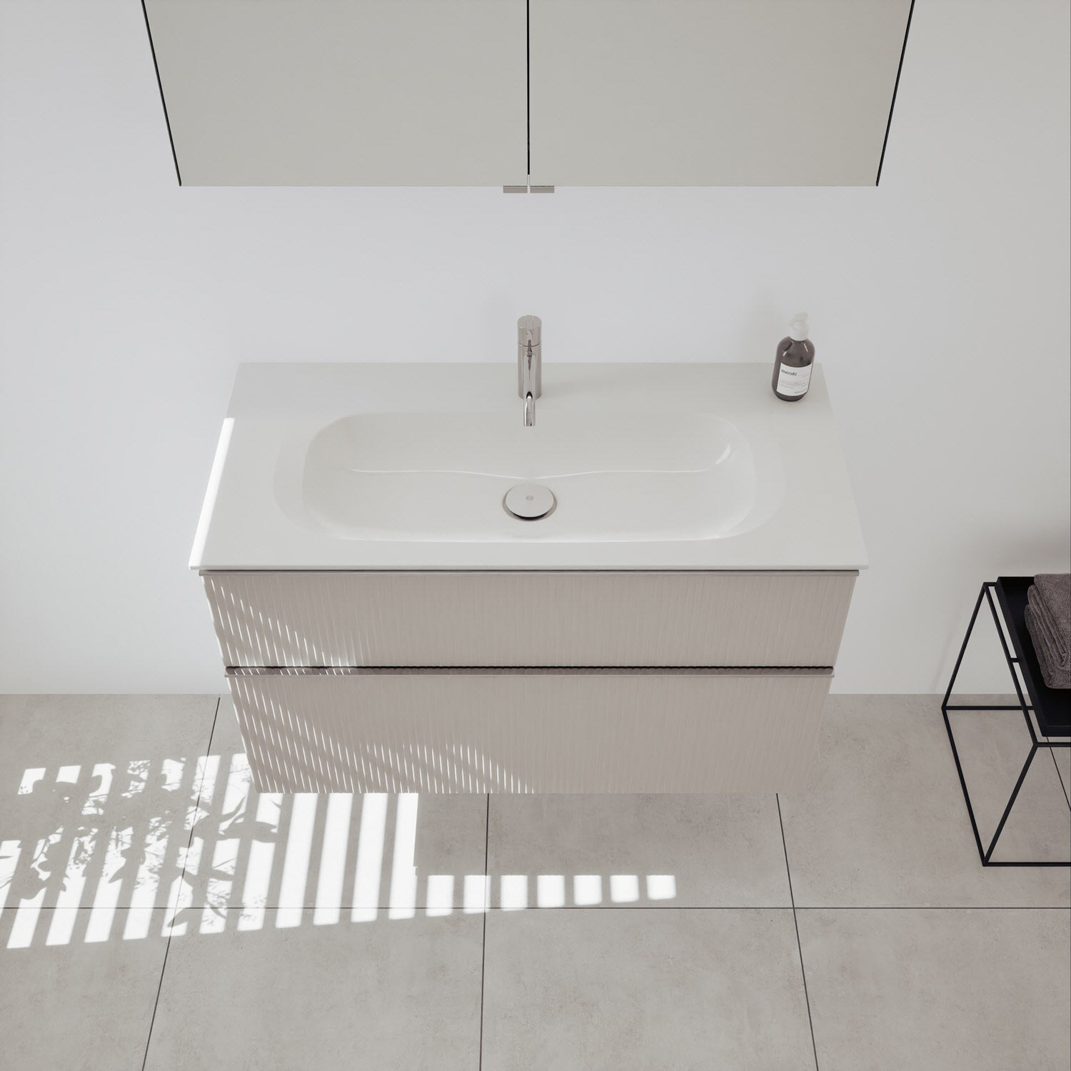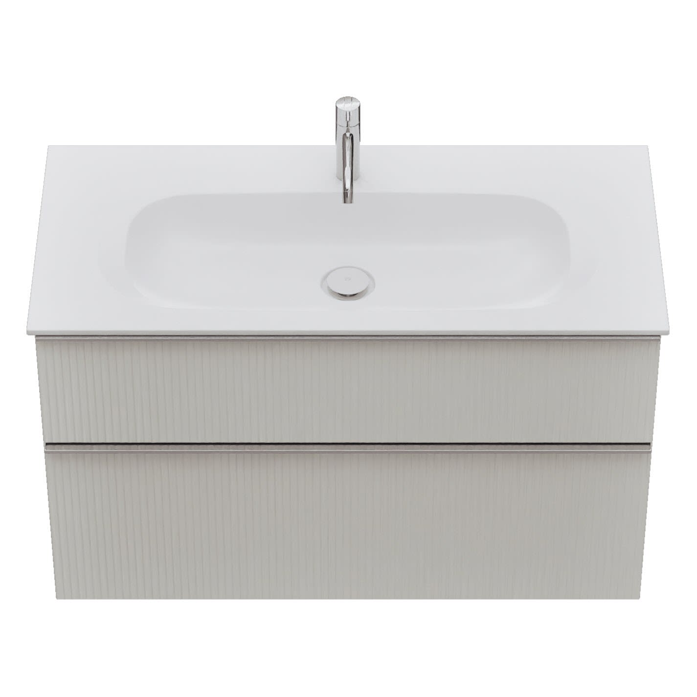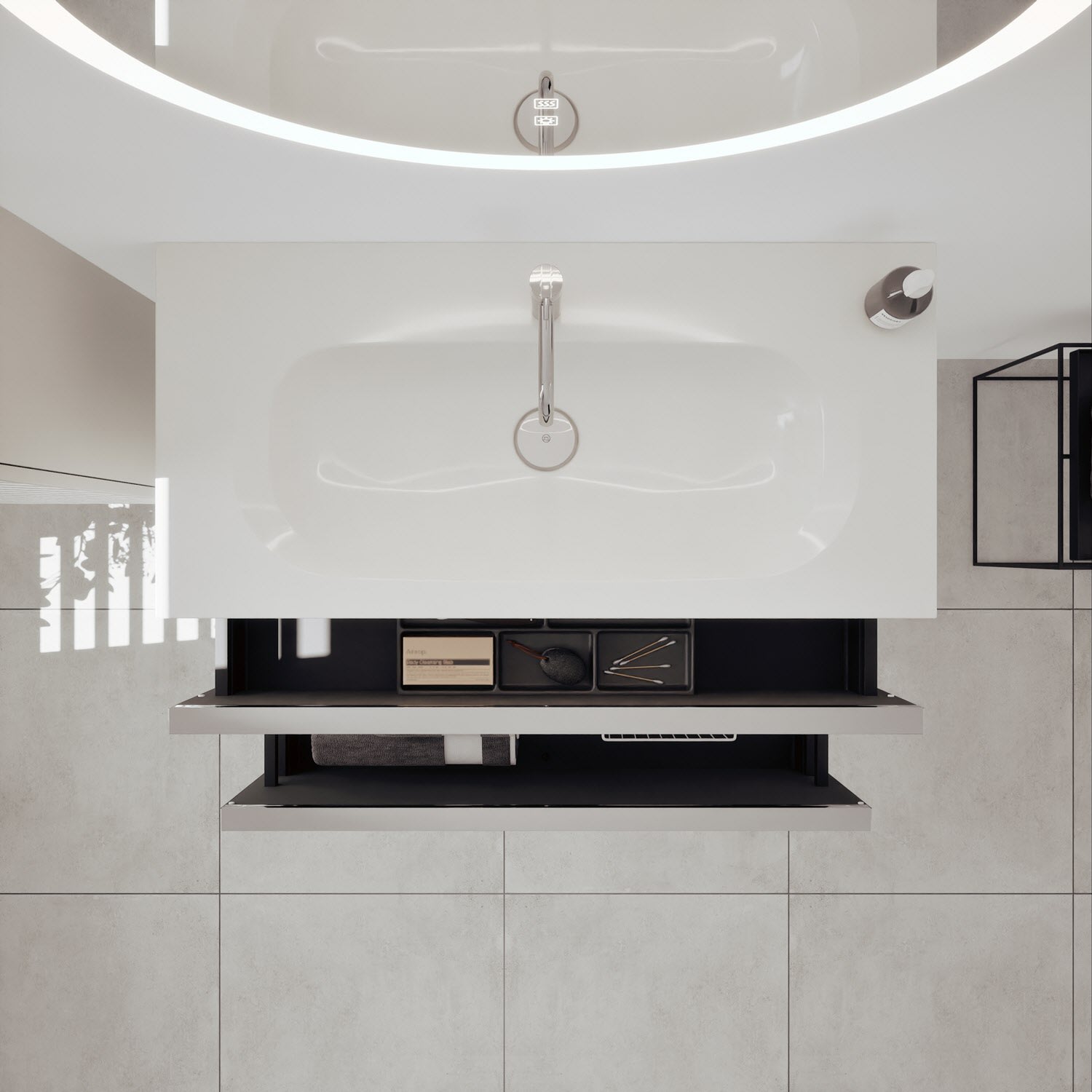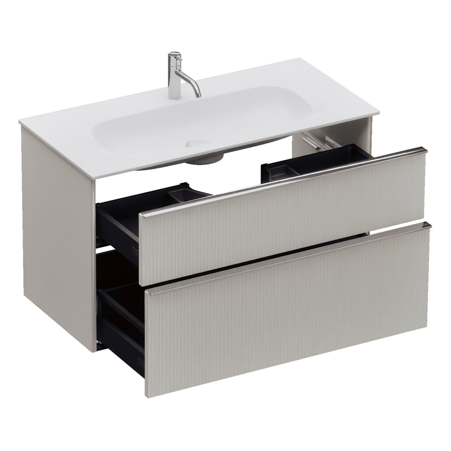 - 1 Schublade oben, 35 cm tief, mit vertikaler Struktur inkl. Siphonausschnitt und Inneneinteilung
