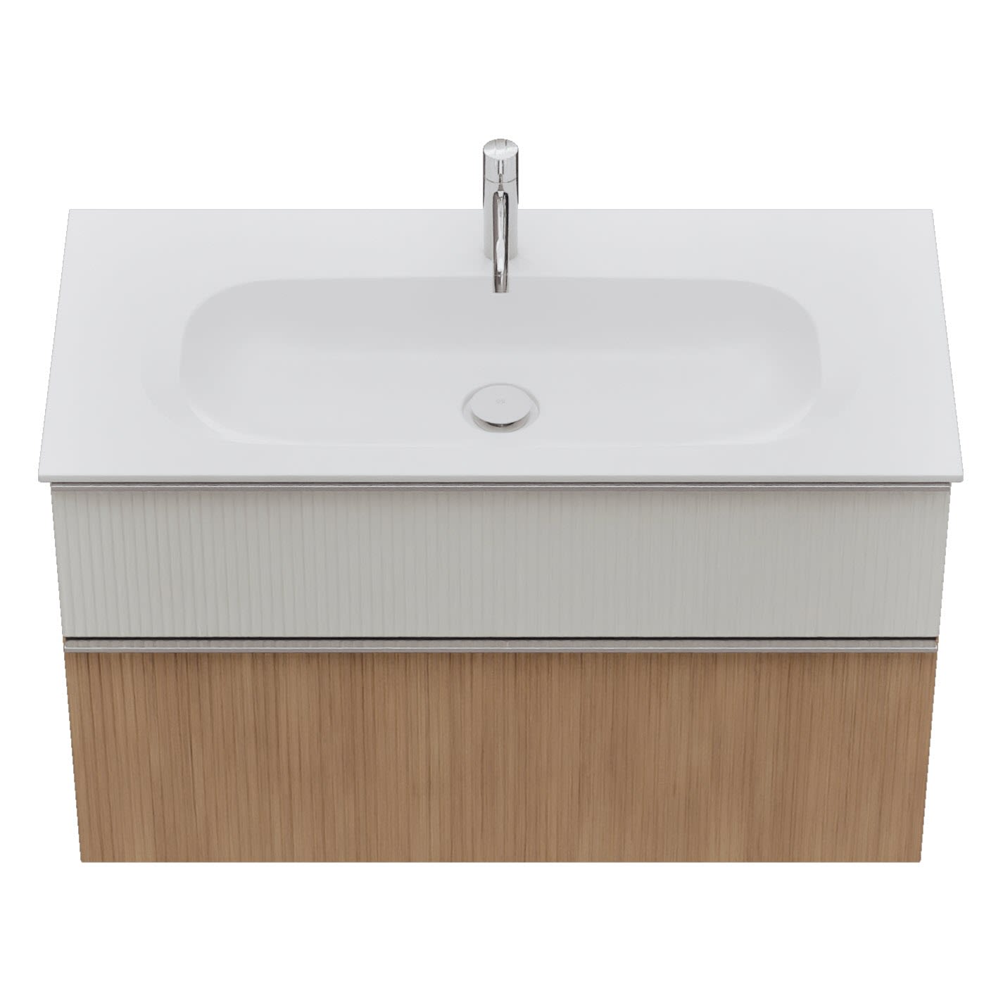 - 1 Schublade oben, 35 cm tief, mit vertikaler Struktur inkl. Siphonausschnitt und Inneneinteilung