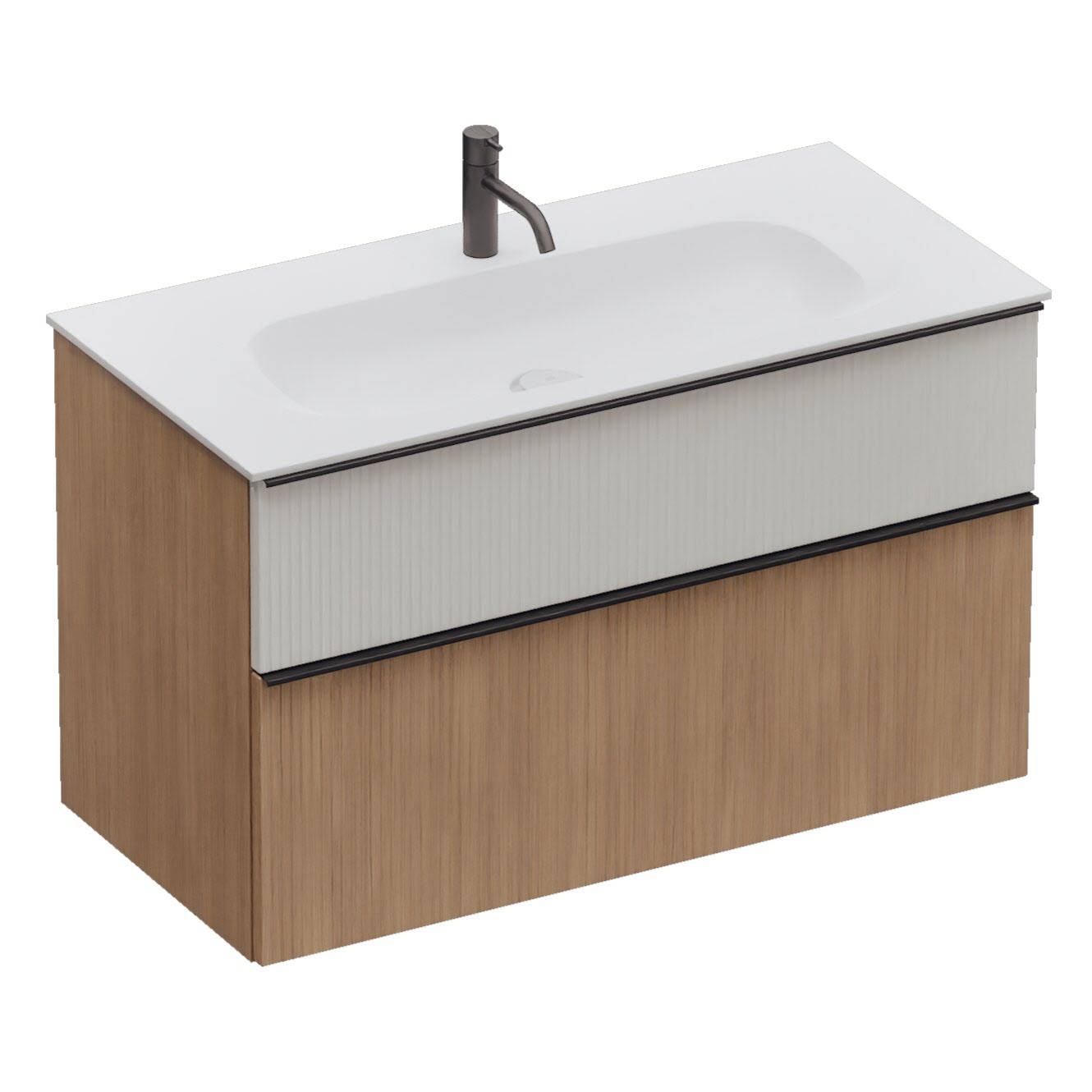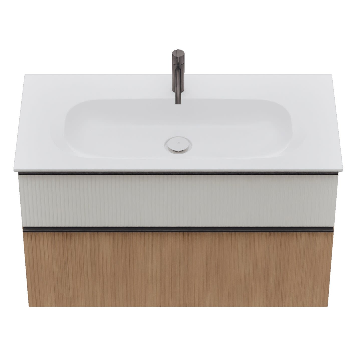 - 1 Schublade oben, 35 cm tief, mit vertikaler Struktur inkl. Siphonausschnitt und Inneneinteilung