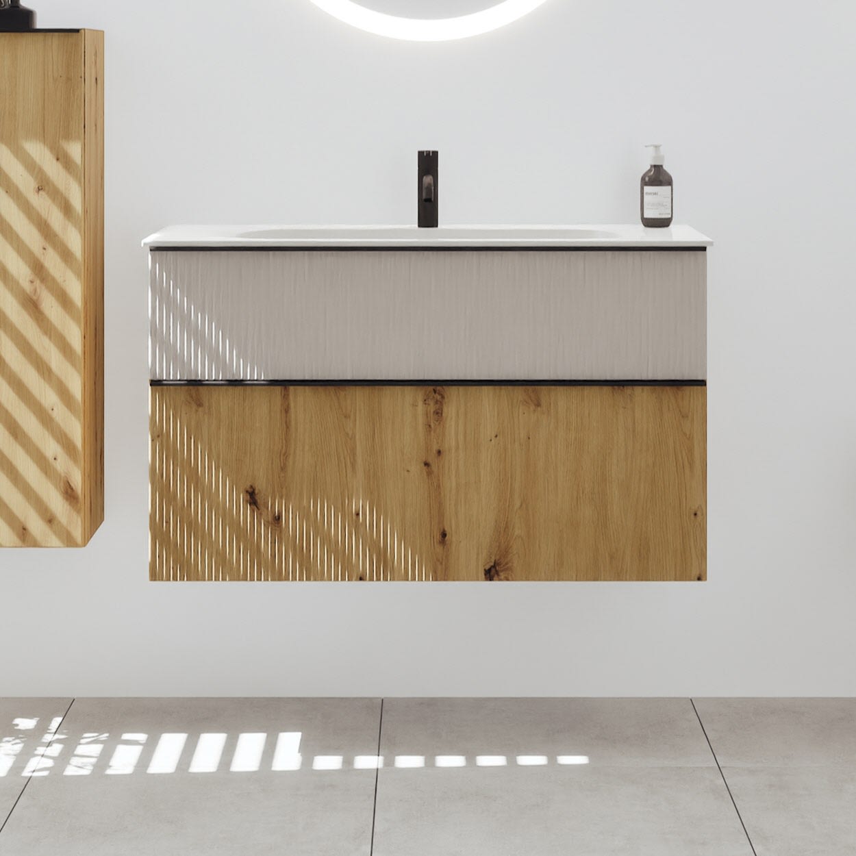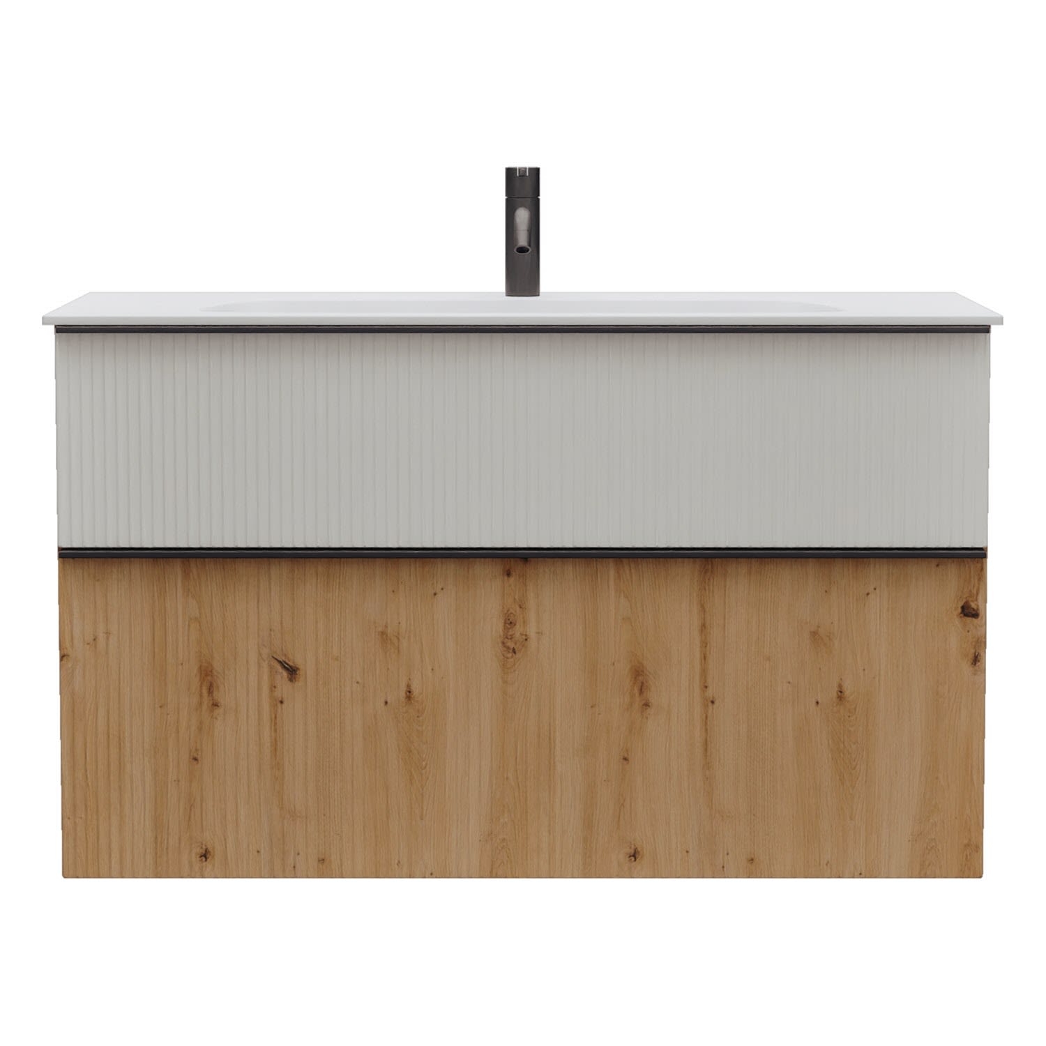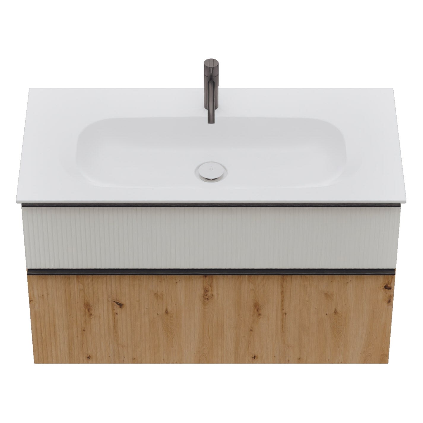 - 1 Schublade oben, 35 cm tief, mit vertikaler Struktur inkl. Siphonausschnitt und Inneneinteilung