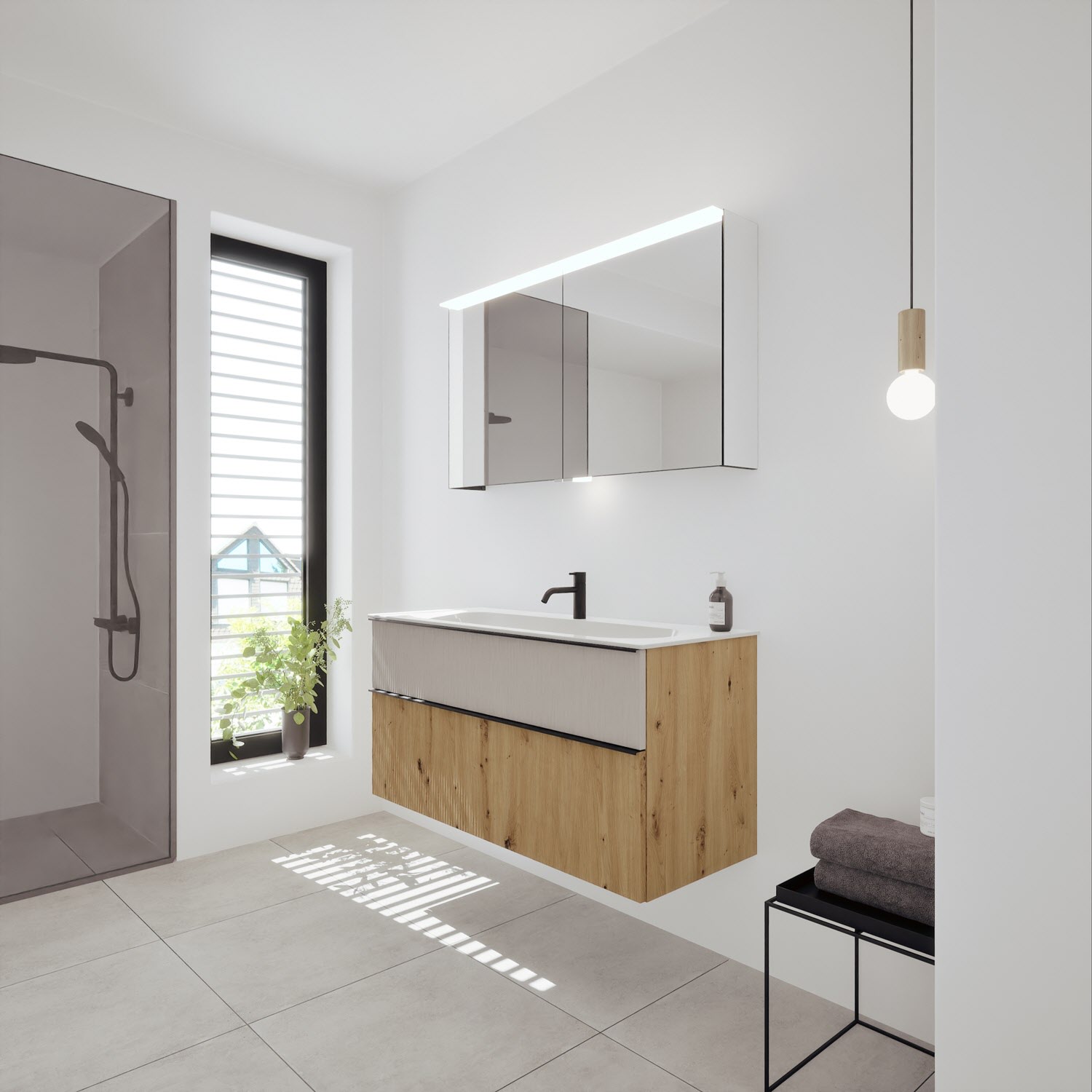 burgbad Fiumo 2.0 Spiegelschrank 120,6 cm mit LED-Aufsatzleuchte und Waschplatzbeleuchtung, 2 Spiegeltüren