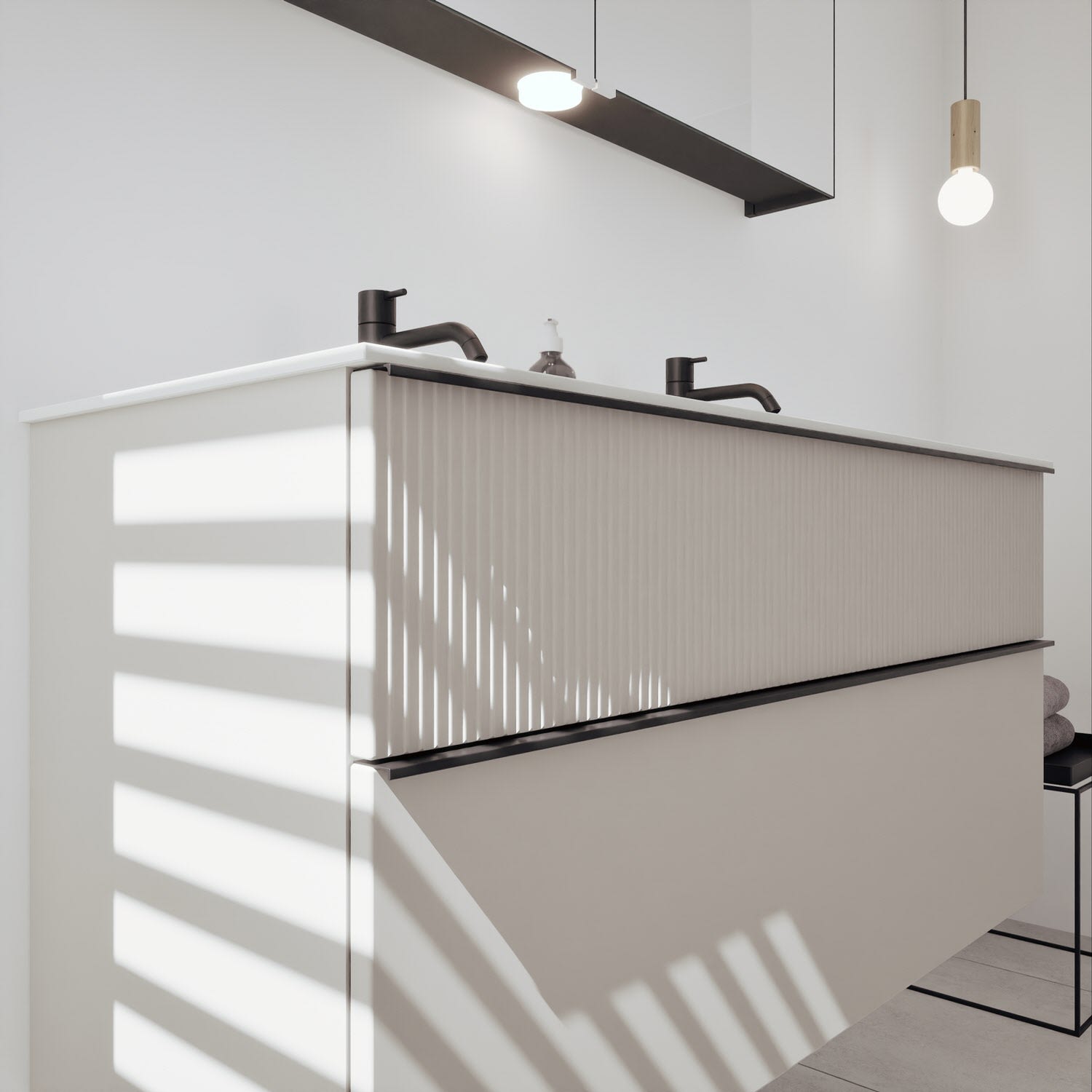 - 1 Schublade oben: 35 cm tief, mit vertikaler Struktur inkl. Siphonausschnitt und Inneneinteilung