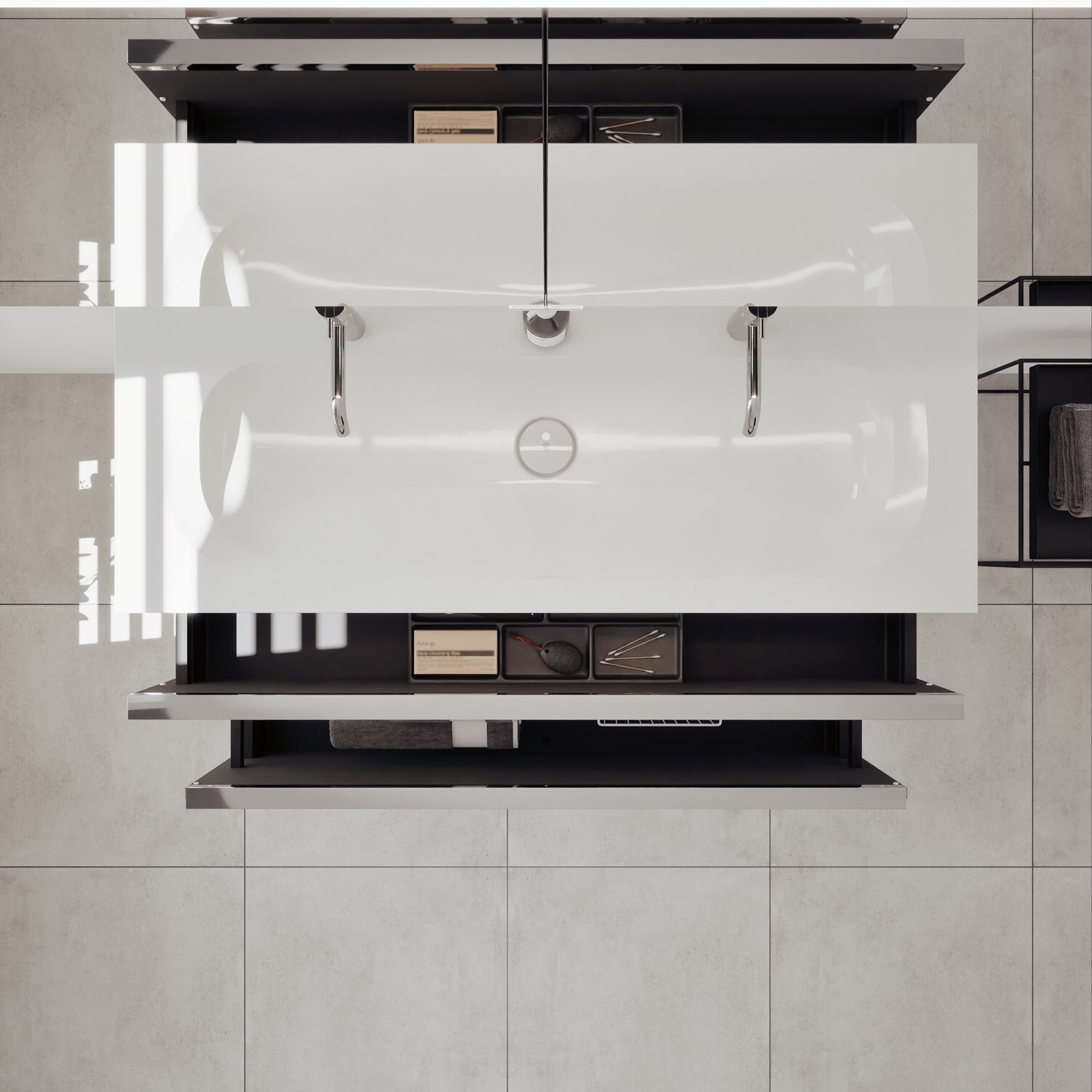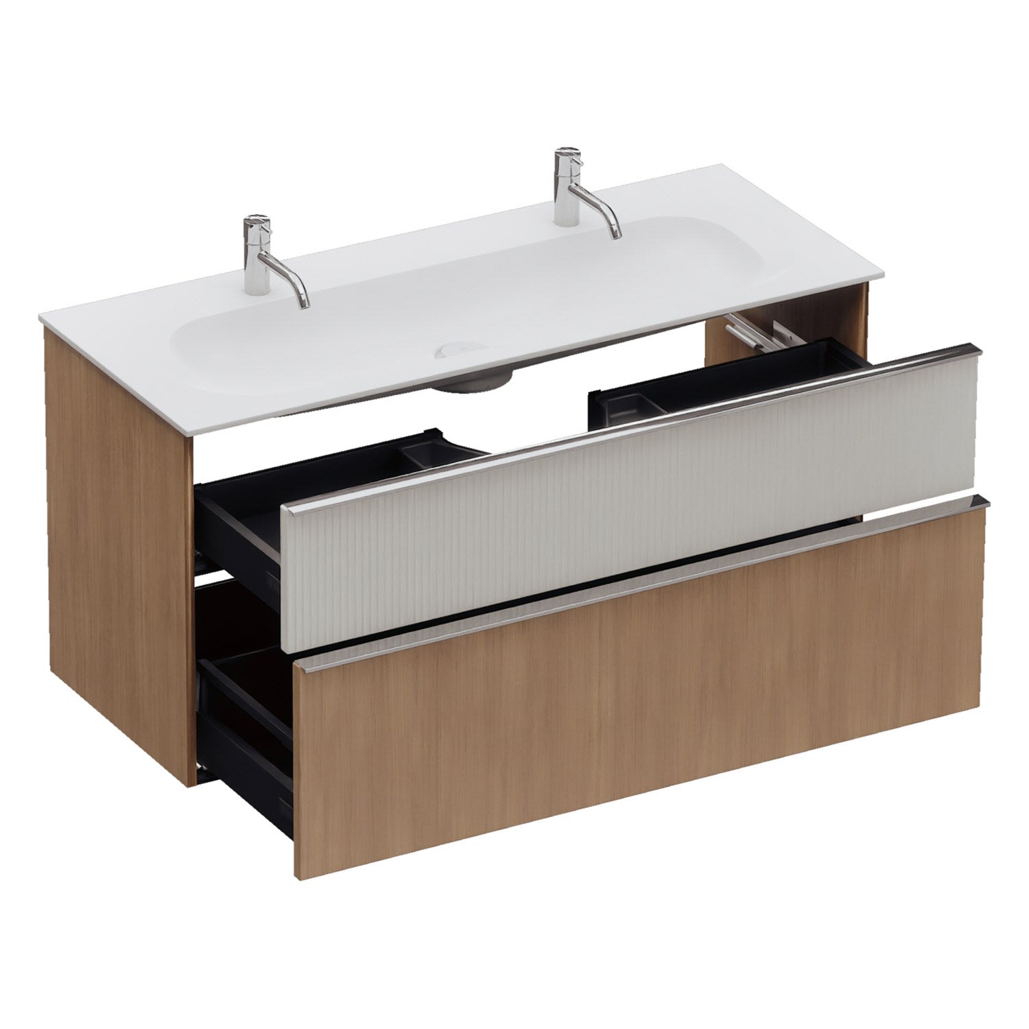 - 1 Schublade oben: 35 cm tief, mit vertikaler Struktur inkl. Siphonausschnitt und Inneneinteilung