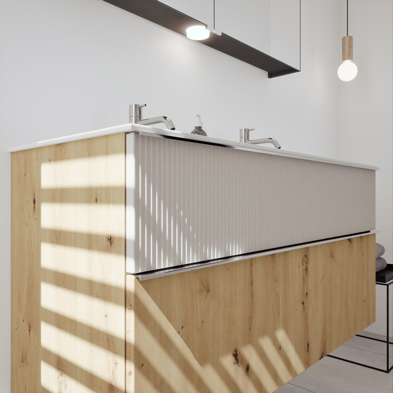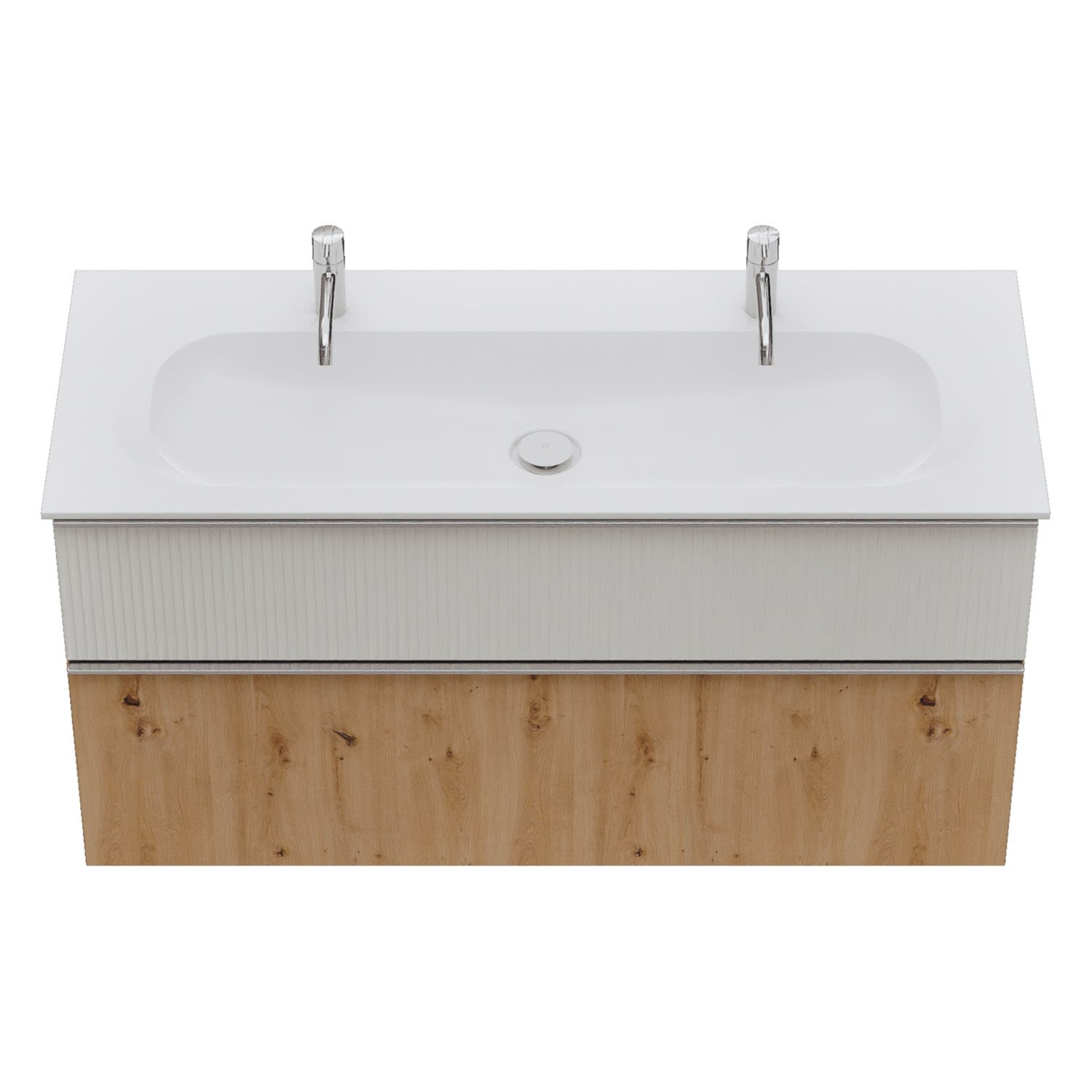 - 1 Schublade oben: 35 cm tief, mit vertikaler Struktur inkl. Siphonausschnitt und Inneneinteilung