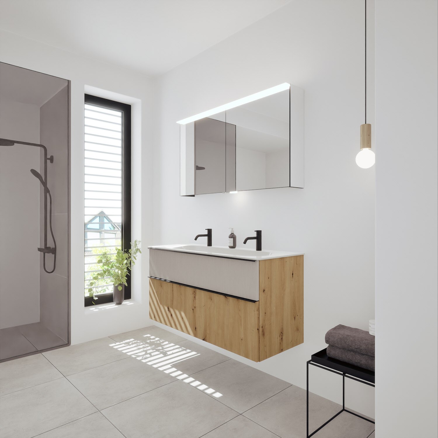 burgbad Fiumo 2.0 Spiegelschrank 120,6 cm mit LED-Aufsatzleuchte und Waschplatzbeleuchtung, 2 Spiegeltüren