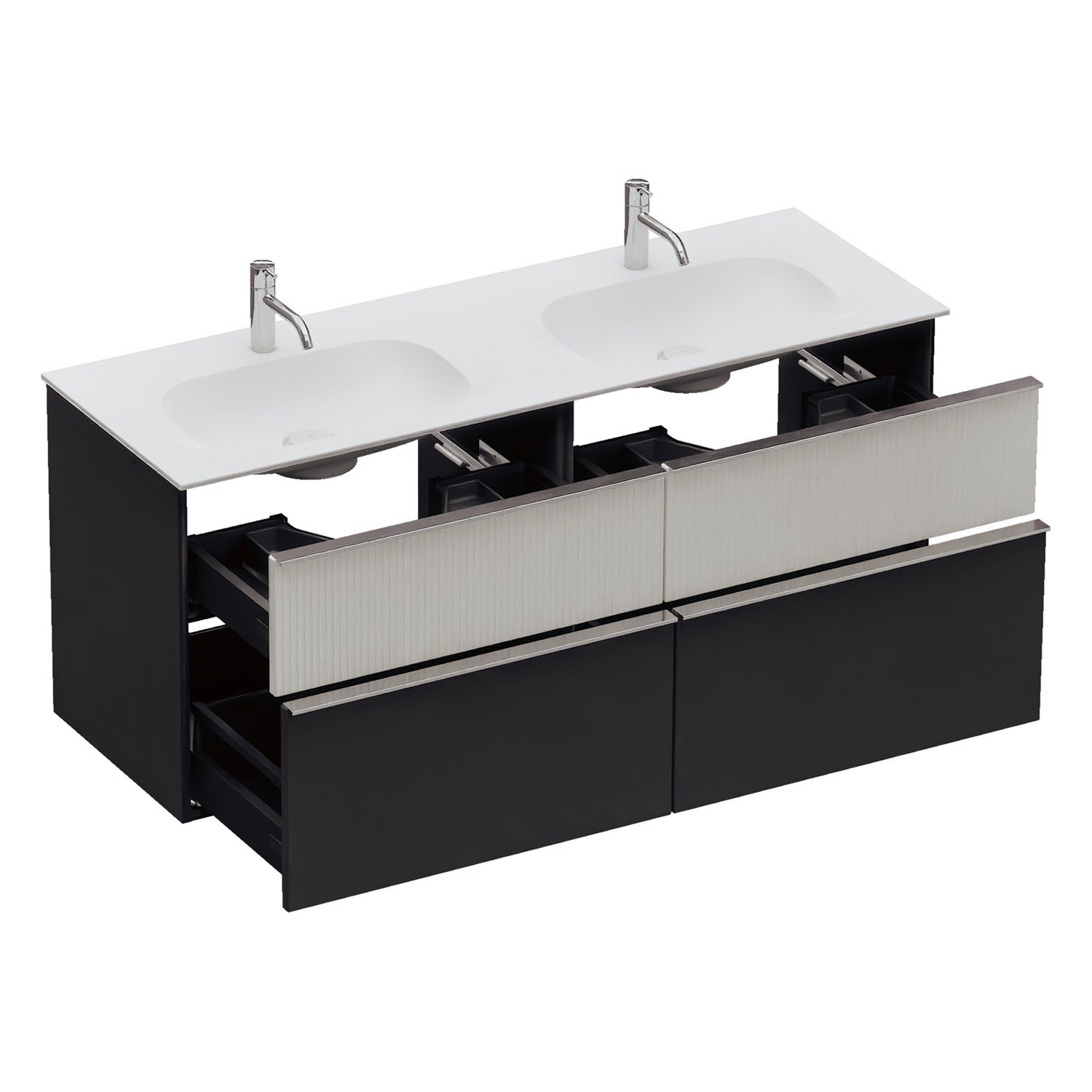 - 2 Schubladen oben, 35 cm tief, mit Siphonausschnitt und Inneneinteilung