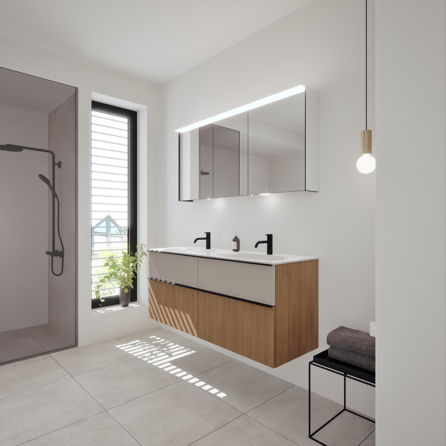 burgbad Fiumo 2.0 Spiegelschrank 140,6 cm mit LED-Aufsatzleuchte und Waschplatzbeleuchtung, 3 Spiegeltüren