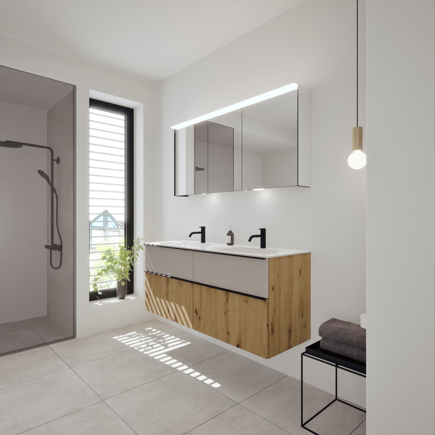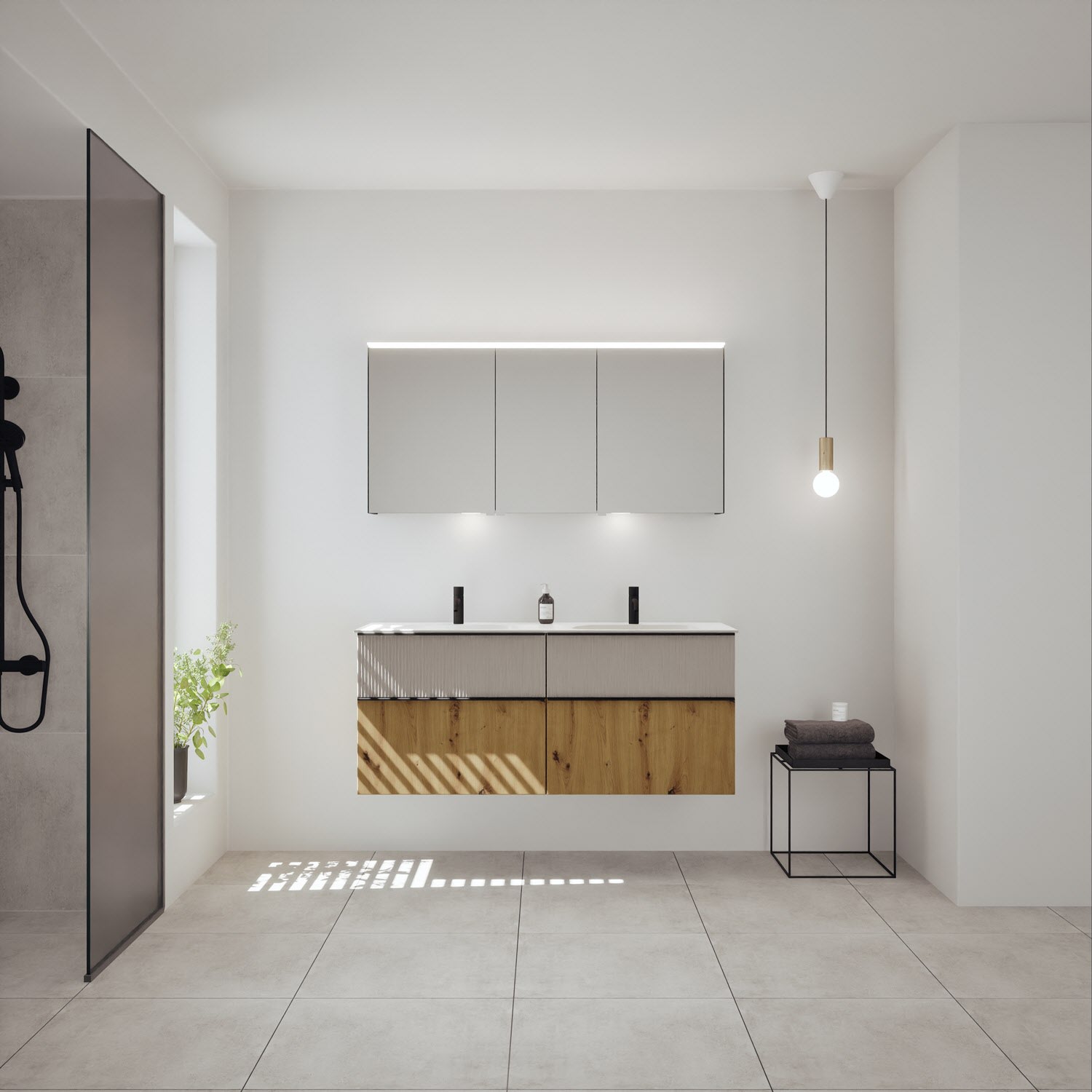 burgbad Fiumo 2.0 Spiegelschrank 140,6 cm mit LED-Aufsatzleuchte und Waschplatzbeleuchtung, 3 Spiegeltüren
